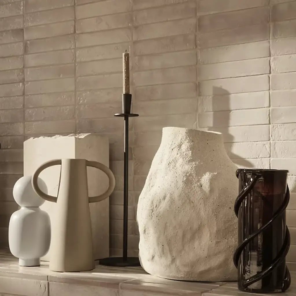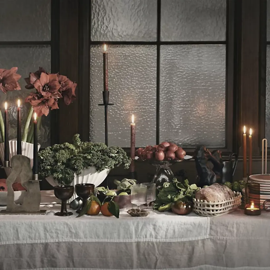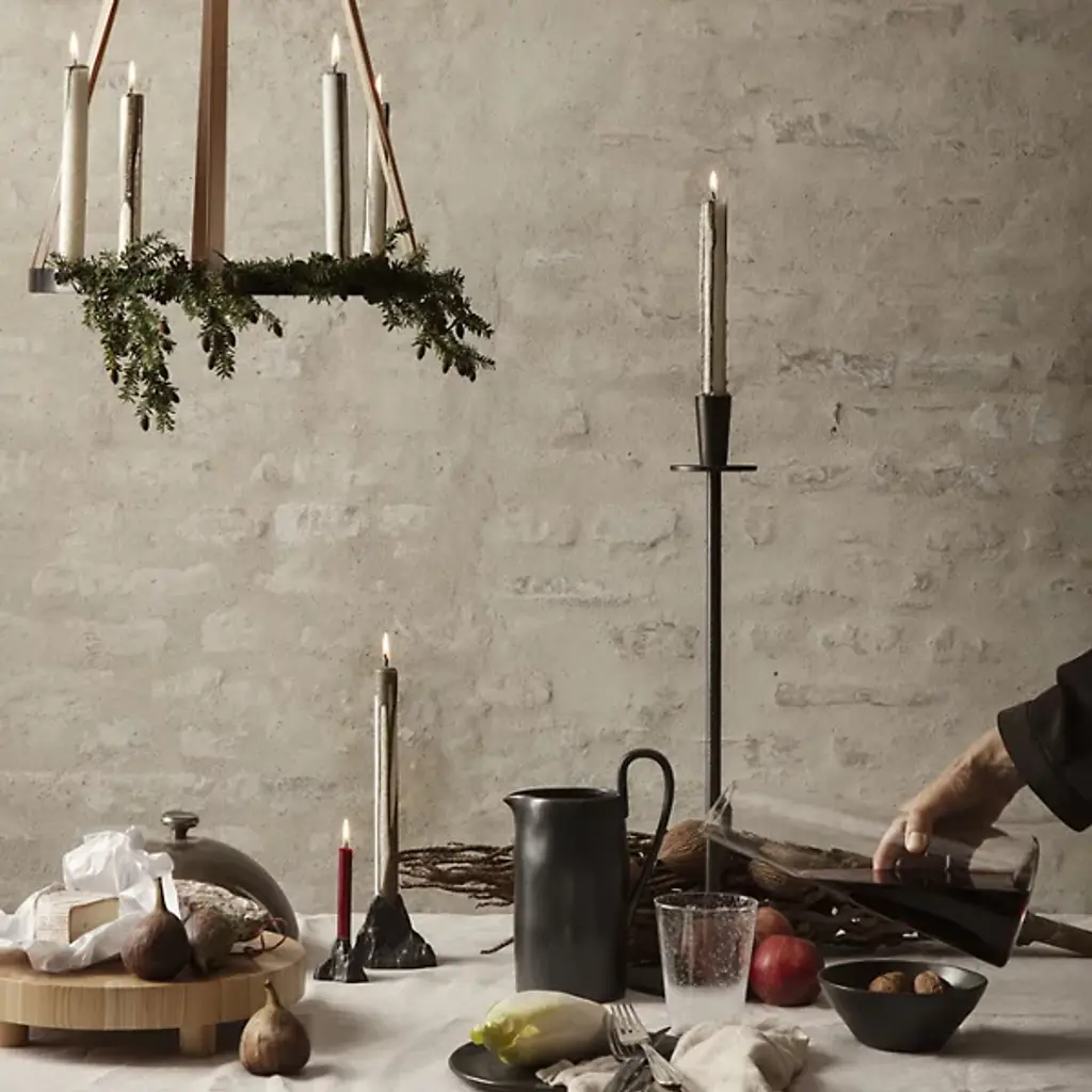 The Hoy Casted Candle Holder from Ferm Living uses recycled casted aluminum to create a tall, minimalist form. The raw matte finish adds subtle texture to the simple design. This piece works in multiple settings—on a beautifully set dinner table, by the fireplace, or on the floor. Safety features include a stable base and proper candle containment. The aluminum construction provides durability while maintaining visual lightness. This candle holder’s proportions allow for dramatic presentation without compromising stability.