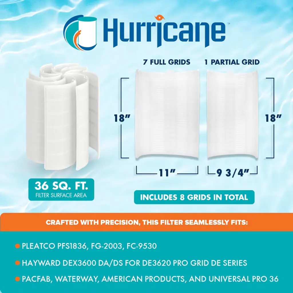 Meticulously fashioned with unwavering precision and tailored for unparalleled performance, this 36-square-foot DE Grid Filter Replacement from Hurricane emerges as the ultimate benchmark for achieving crystal-clear pool water. Designed to surpass expectations, this filter replacement offers unparalleled compatibility with leading brands such as PFS1836, FG-2003, FC-9530, and Hayward DEX3600 DA/DS. Boasting a generous 36 square feet of filter surface area, this filter set includes 7 full grids, each measuring 11 inches wide by 18 inches tall, and 1 partial smaller grid measuring 9 3/4 inches in width and 18 inches tall. With a total of 8 grids, every corner of your pool is safeguarded against impurities with this clean pool essential. Seamless integration meets effortless installation with the HFDE36-SET pool and spa filter. Engineered to fit flawlessly with your existing DE Filter Element Locator, installation is a breeze, requiring just a few minutes of your time. Bid farewell to cumbersome setups and hello to hassle-free maintenance. Experience the pinnacle of filtration technology as you revel in crystal-clear water with Hurricane Filters HFDE36-SET. Transform your pool and spa system into a sanctuary of serenity, where every dip is a rejuvenating experience. Embrace the superior quality and undeniable value of Hurricane Filters HFDE36-SET, because your oasis deserves nothing less.