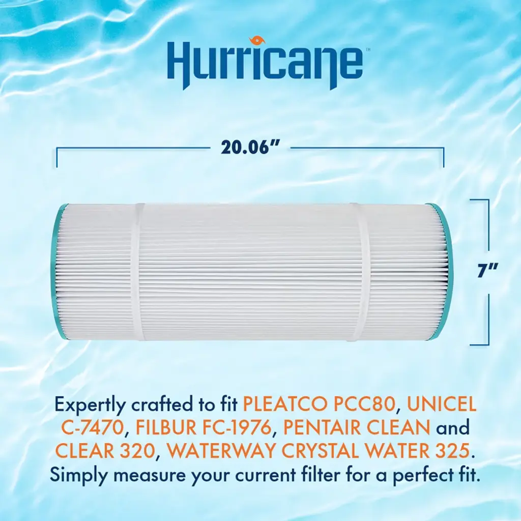 Dive into the realm of pristine waters with the Hurricane HF7470-04 Advanced Cartridge Filter, where unparalleled cleanliness awaits. Crafted with meticulous precision, this filter guarantees seamless compatibility with a range of models including PCC80, Unicel C-7470, Filbur FC-1976, Pentair Clean and Clear 320, Waterway Crystal Water 325, and other compatible models. With dimensions measuring 7 inches in length and in outer diameter, and 20.06 in height, achieving an ideal fit is effortless, just measure your current filter for a flawless match. Experience a new level of filtration prowess with its advanced point bond filter media, elevating filtration effectiveness beyond traditional non-woven materials. From biomass to dirt, debris, hair, leaves, and even critters, this filter acts as a formidable barrier, leaving your pool or spa immaculate and inviting. Esteemed by both industry professionals and homeowners, this filter is meticulously engineered for durability, ensuring prolonged service life and effortless upkeep. Bid farewell to the inconvenience of frequent replacements and welcome substantial savings on filters, all while minimizing wear and tear on your pump. Discover the exceptional cleaning prowess of the Hurricane HF7470-04 Advanced Cartridge Filter, your ultimate solution for pristine waters and unparalleled excellence.