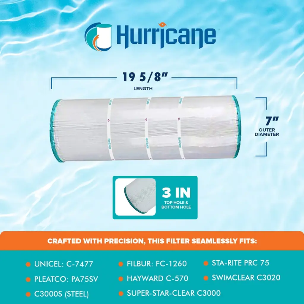 Dive into pristine waters with the Hurricane 12-pack HF7477-04 Advanced Cartridge Filter, where unparalleled cleanliness awaits. Crafted with meticulous precision, this filter guarantees seamless compatibility with Unicel: C-7477, PA75SV, Filbur: FC-1260, Hayward C-570, SwimClear C3020, Super-Star-Clear C3000, C3000S (stainless steel), Sta-Rite PRC 75, and other compatible models. With dimensions measuring 19.75 inches in length, an outer diameter of 7 inches, a top hole of 3 inches, and a Bottom hole of 3 inches, achieving an ideal fit is effortless, measure your current filter for a flawless match. Experience a new level of filtration prowess with the advanced point bond filter media of this spa essential, elevating filtration effectiveness beyond traditional non-woven materials. From biomass to dirt, debris, hair, leaves, and even critters, this pool filter is a formidable barrier, leaving your pool or spa immaculate and inviting. Esteemed by both industry professionals and homeowners, this spa accessory is meticulously engineered for durability, ensuring prolonged service life and effortless upkeep. Bid farewell to the inconvenience of frequent replacements and welcome substantial savings on filters, all while minimizing wear and tear on your pump. Discover the exceptional cleaning prowess of the Hurricane 12-pack HF7477-04 Advanced Cartridge Filter, your ultimate solution for pristine waters and unparalleled excellence.