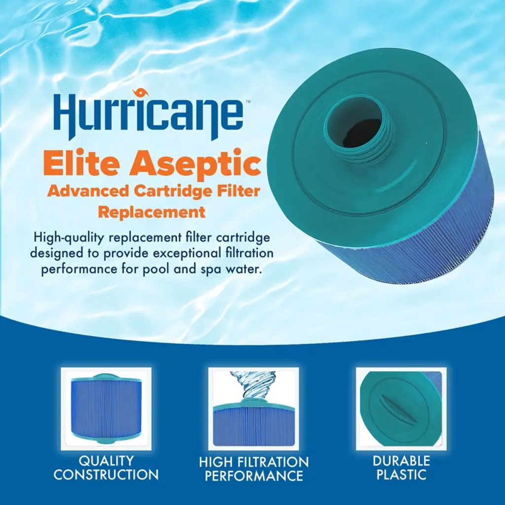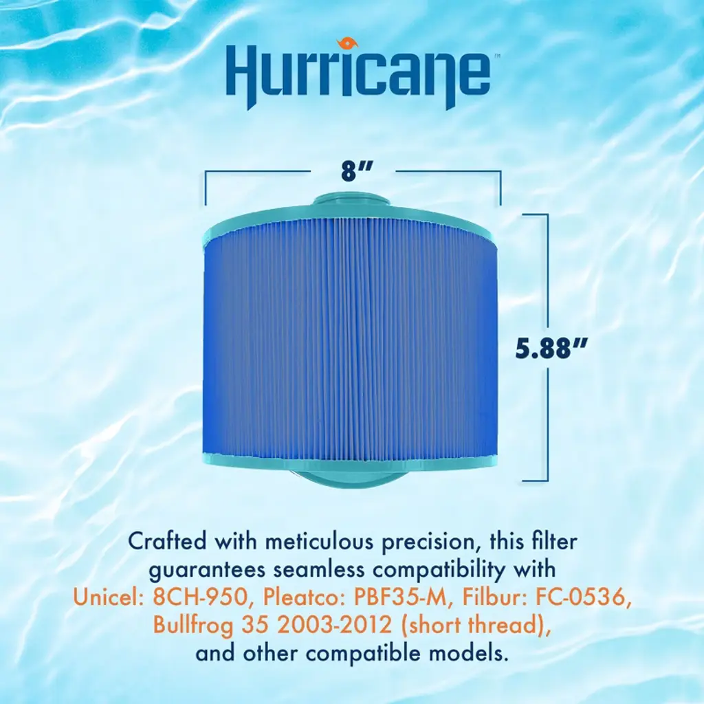 Dive into pristine waters with the Hurricane Elite Aseptic Cartridge Filter, where unparalleled cleanliness awaits. Crafted with meticulous precision, this filter guarantees seamless compatibility with Unicel: 8CH-950, PBF35-M, Filbur: FC-0536, Bullfrog 35 2003-2012 (short thread), and other compatible models. With dimensions measuring 5.88 inches in length, an outer diameter of 8 inches, a top hole handle, and a Bottom hole of 2 inches, achieving an ideal fit is effortless, measure your current filter for a flawless match. Experience a new level of filtration prowess with the advanced point bond filter media of this spa essential, elevating filtration effectiveness beyond traditional non-woven materials. From biomass to dirt, debris, hair, leaves, and even critters, this pool filter is a formidable barrier, leaving your pool or spa immaculate and inviting. Esteemed by both industry professionals and homeowners, this spa accessory is meticulously engineered for durability, ensuring prolonged service life and effortless upkeep. Bid farewell to the inconvenience of frequent replacements and welcome substantial savings on filters, all while minimizing wear and tear on your pump. Discover the exceptional cleaning prowess of the Hurricane Elite Aseptic Cartridge Filter, your ultimate solution for pristine waters and unparalleled excellence.