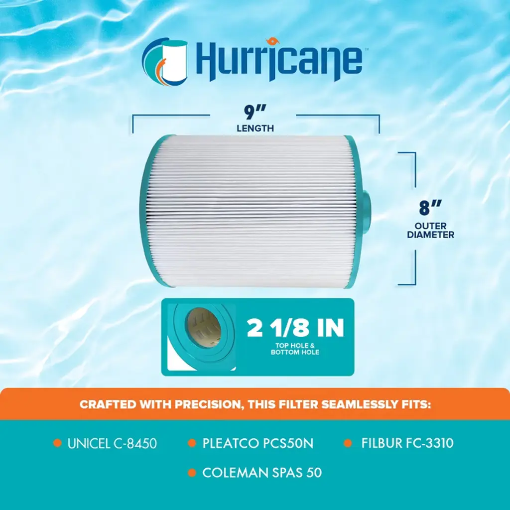 Dive into the realm of pristine waters with the Hurricane HF8450-01 Advanced Cartridge Filters, where unparalleled cleanliness awaits. Crafted with meticulous precision, these filters guarantee seamless compatibility with a range of models, including Unicel C-8450, PCS50N, Filbur FC-3310, Coleman Spas 50, and other compatible models. With dimensions measuring 9 inches in length, an outer diameter of 8 inches, and top and bottom holes being 2.13 inches, achieving an ideal fit is effortless. Measure your current filters for a flawless match. Experience a new level of filtration prowess with the advanced point bond filter media of these spa essentials, elevating filtration effectiveness beyond traditional non-woven materials. From biomass to dirt, debris, hair, leaves, and even critters, these filter cartridges are formidable barriers, leaving your pool or spa immaculate and inviting. Esteemed by both industry professionals and homeowners, these spa accessories are meticulously engineered for durability, ensuring prolonged service life and effortless upkeep. Bid farewell to the inconvenience of frequent replacements and welcome substantial savings on filters, all while minimizing wear and tear on your pump. Discover the exceptional cleaning prowess of the Hurricane HF8450-01 Advanced Cartridge Filters, your ultimate solution for pristine waters and unparalleled excellence.