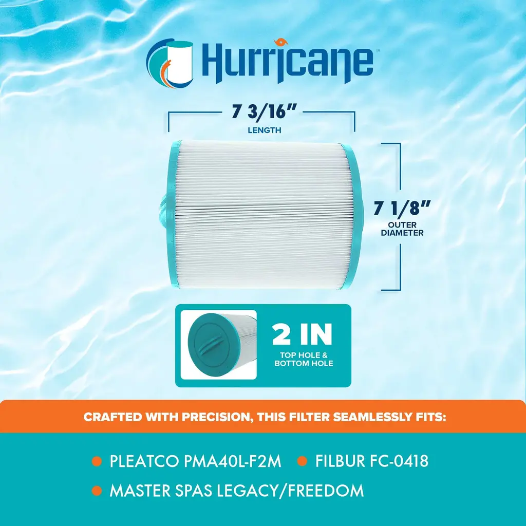 Dive into pristine waters with the Hurricane HF-MAS07-01 Advanced Cartridge Filter, where unparalleled cleanliness awaits. Crafted with meticulous precision, this filter guarantees seamless compatibility with PMA40L-F2M, Filbur FC-0418, Master Spas Legacy/Freedom, and other compatible models. With dimensions measuring 7.19 inches in length, outer diameter 7.13 inches, top handle, and bottom hole 2 MPT fine threaded, achieving an ideal fit is effortless, measure your current filter for a flawless match. Experience a new level of filtration prowess with the advanced point bond filter media of this spa essential, elevating filtration effectiveness beyond traditional non-woven materials. From biomass to dirt, debris, hair, leaves, and even critters, this pool filter is a formidable barrier, leaving your pool or spa immaculate and inviting. Esteemed by both industry professionals and homeowners, this spa accessory is meticulously engineered for durability, ensuring prolonged service life and effortless upkeep. Bid farewell to the inconvenience of frequent replacements and welcome substantial savings on filters, all while minimizing wear and tear on your pump. Discover the exceptional cleaning prowess of the Hurricane HF-MAS07-01 Advanced Cartridge Filter, your ultimate solution for pristine waters and unparalleled excellence. Advanced cartridge filter HF-MAS07-01 to experience a whole new level of cleanliness, ideal for keeping water pristine and enjoyable Crafted with meticulous precision, this filter guarantees seamless compatibility with PMA40L-F2M, Filbur FC-0418, Master Spas Legacy/Freedom, and other compatible models Advanced point bond filter media traps everything from biomass to dirt, debris, hair, leaves, and critters, leaving your pool or spa immaculate Engineered to last longer and are incredibly easy to clean, so you can say goodbye to frequent replacements and hello to significant savings on filters, along with reduced wear and tear on your pump Delight in the advantages of superior pleat material, end caps, and max flow cores for unmatched quality Color: White Dimensions (L x W x H): 7.19 x 7.13 x 7.13 inches Weight: 1.4 pounds