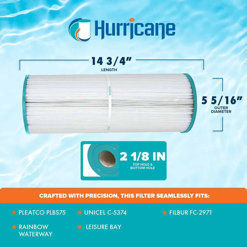 Dive into the realm of pristine waters with the Hurricane HF5374-01 Advanced Cartridge Filter, where unparalleled cleanliness awaits. Crafted with meticulous precision, this filter guarantees seamless compatibility with a range of models including PLBS75 Unicel C-5374, Filbur FC-2971, Rainbow, Waterway, Leisure Bay, S2, G2 Spa 75, and other compatible models. With dimensions measuring 14.81 inches in length, an outer diameter of 5.31 inches, and top and bottom holes being 4 inches, achieving an ideal fit is effortless, measure your current filter for a flawless match. Experience a new level of filtration prowess with the advanced point bond filter media of this spa essential, elevating filtration effectiveness beyond traditional non-woven materials. From biomass to dirt, debris, hair, leaves, and even critters, this filter cartridge is a formidable barrier, leaving your pool or spa immaculate and inviting. Esteemed by both industry professionals and homeowners, this spa accessory is meticulously engineered for durability, ensuring prolonged service life and effortless upkeep. Bid farewell to the inconvenience of frequent replacements and welcome substantial savings on filters, all while minimizing wear and tear on your pump. Discover the exceptional cleaning prowess of the Hurricane HF5374-01 Advanced Cartridge Filter, your ultimate solution for pristine waters and unparalleled excellence. Advanced cartridge filter HF5374-01 to experience a whole new level of cleanliness, ideal for keeping water pristine and enjoyable Crafted with precision, this filter seamlessly fits PLBS75 Unicel C-5374 , Filbur FC-2971, Rainbow, Waterway, Leisure Bay, S2, G2 Spa 75, and more; Simply measure your current filter for a flawless fit Advanced point bond filter media traps everything from biomass to dirt, debris, hair, leaves, and critters, leaving your pool or spa immaculate Engineered to last longer and are incredibly easy to clean, so you can say goodbye to frequent replacements and hello to significant savings on filters, along with reduced wear and tear on your pump Delight in the advantages of superior pleat material, end caps, and max flow cores for unmatched quality Color: White Dimensions (L x W x H): 14.81 x 5.31 x 5.31 inches
