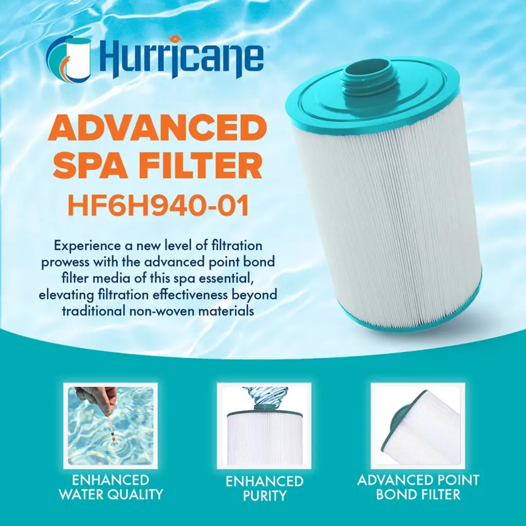 Dive into pristine waters with the Hurricane HF6H940-01 Advanced Cartridge Filter, where unparalleled cleanliness awaits. Crafted with meticulous precision, this filter guarantees seamless compatibility with Unicel: 6CH-940, PWW50P3, Filbur: FC-0359, Waterway Front Access Skimmer, and other compatible models. With dimensions measuring 7.63 inches in length, an outer diameter of 6 inches, a top handle, and a bottom hole of 1.5 inches of SAE Threaded inches, achieving an ideal fit with this filter cartridge is effortless, measure your current filter for a flawless match. Experience a new level of filtration prowess with this spa essential's advanced point bond filter media, elevating filtration effectiveness beyond traditional non-woven materials. From biomass to dirt, debris, hair, leaves, and even critters, this pool filter is a formidable barrier, leaving your pool or spa immaculate and inviting. Esteemed by industry professionals and homeowners, this spa accessory is meticulously engineered for durability, ensuring prolonged service life and effortless upkeep. Bid farewell to the inconvenience of frequent replacements and welcome substantial savings on filters, all while minimizing wear and tear on your pump. Discover the exceptional cleaning prowess of the Hurricane HF6H940-01 Advanced Cartridge Filter, your ultimate solution for pristine waters and unparalleled excellence.