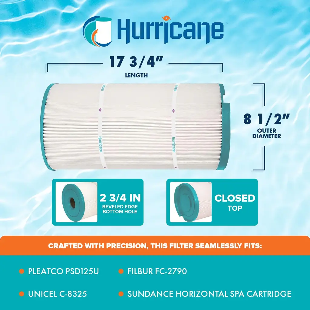 Dive into the realm of pristine waters with the Hurricane HF8325-01 Advanced Cartridge Filter, where unparalleled cleanliness awaits. Crafted with meticulous precision, this filter guarantees seamless compatibility with a range of models including Unicel C-8325, PSD125U, Filbur FC-2790, Sundance Horizontal Spa Cartridge, and other compatible models. With dimensions measuring 17.75 inches in length, an outer diameter of 8.5 inches, the top closed with a strong handle, and the bottom hole being 0.5 inch MPT threaded, achieving an ideal fit is effortless, measure your current filter for a flawless match. Experience a new level of filtration prowess with the advanced point bond filter media of this spa essential, elevating filtration effectiveness beyond traditional non-woven materials. From biomass to dirt, debris, hair, leaves, and even critters, this filter cartridge is a formidable barrier, leaving your pool or spa immaculate and inviting. Esteemed by both industry professionals and homeowners, this spa accessory is meticulously engineered for durability, ensuring prolonged service life and effortless upkeep. Bid farewell to the inconvenience of frequent replacements and welcome substantial savings on filters, all while minimizing wear and tear on your pump. Discover the exceptional cleaning prowess of the Hurricane HF8325-01 Advanced Cartridge Filter, your ultimate solution for pristine waters and unparalleled excellence. Advanced cartridge filter HF8325-01 to experience a whole new level of cleanliness, ideal for keeping water pristine and enjoyable Crafted with precision, this filter seamlessly fits Unicel C-8325, PSD125U, Filbur FC-2790, Sundance Horizontal Spa Cartridge, and more; Simply measure your current filter for a flawless fit Advanced point bond filter media traps everything from biomass to dirt, debris, hair, leaves, and critters, leaving your pool or spa immaculate Engineered to last longer and are incredibly easy to clean, so you can say goodbye to frequent replacements and hello to significant savings on filters, along with reduced wear and tear on your pump Delight in the advantages of superior pleat material, end caps, and max flow cores for unmatched quality Color: White Dimensions (L x W x H): 17.75 x 8.5 x 8.5 inches