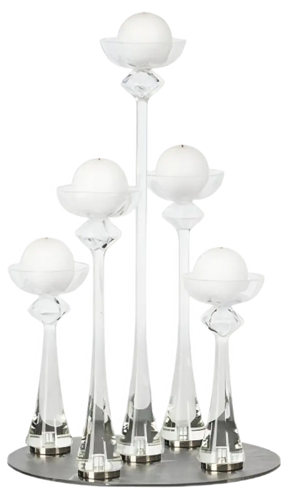 Stunning hyaline quartz beads progressively decreasing in size lend this candleholder its singular jewel-like aesthetic. The luminous nickel-plated brass frame gets revealed with the multifaceted base and sharp top spike where the candle will find its steady placement. Please explore the Artemest catalog for the smoky quartz variant.