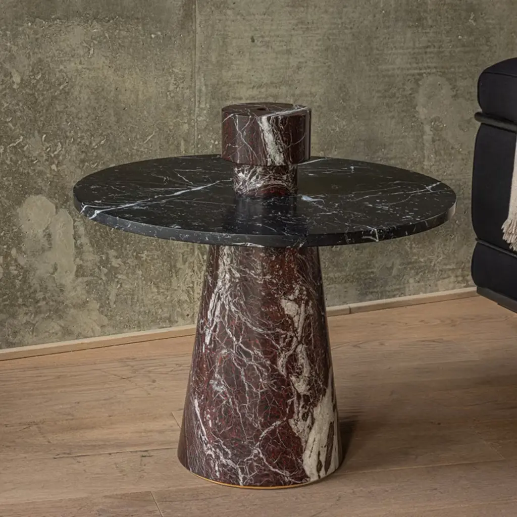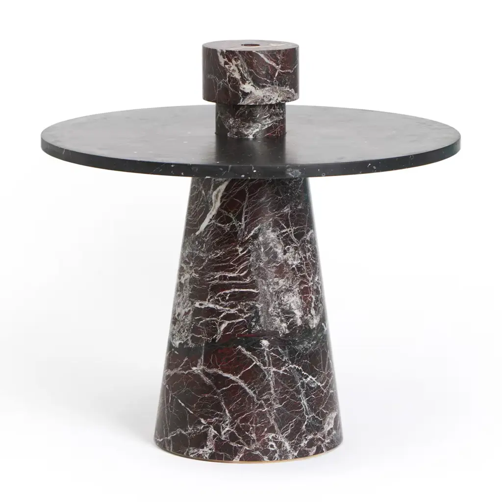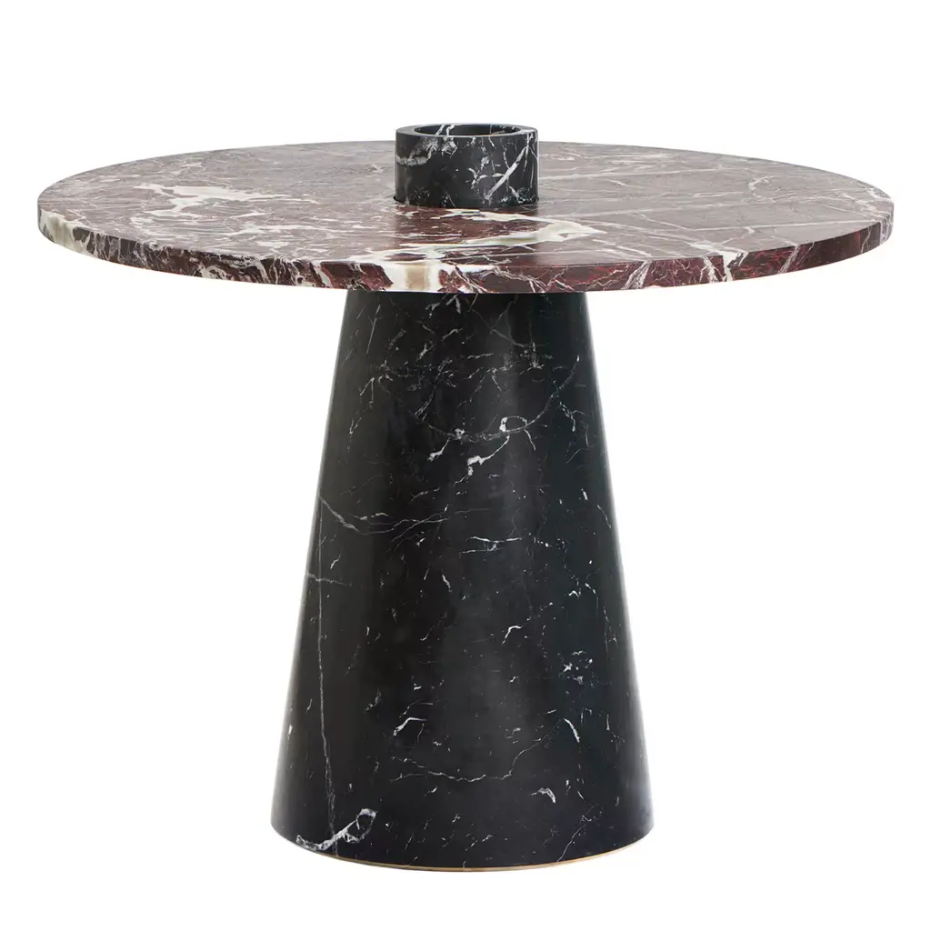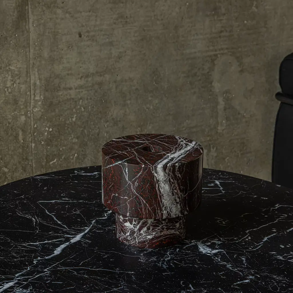 Exuding pure sculptural flair, this refined candleholder was conceived by Karen Chekerdjian as a complementary accessory for fitting into the tops of the tables from the Inside Out Collection. The minimalist yet evocative shape in red Levanto marble stands out for the eye-catching veining that extends throughout the two stacked, different-sized cylinders composing its geometric body. Any candle is sure to splendidly enhance the one-off characteristics of this unique candleholder. Please note that marbles and stones are natural materials and they can differ also if coming from the same quarry or the same block. The product shown may differ from purchased items. Every piece is unique.