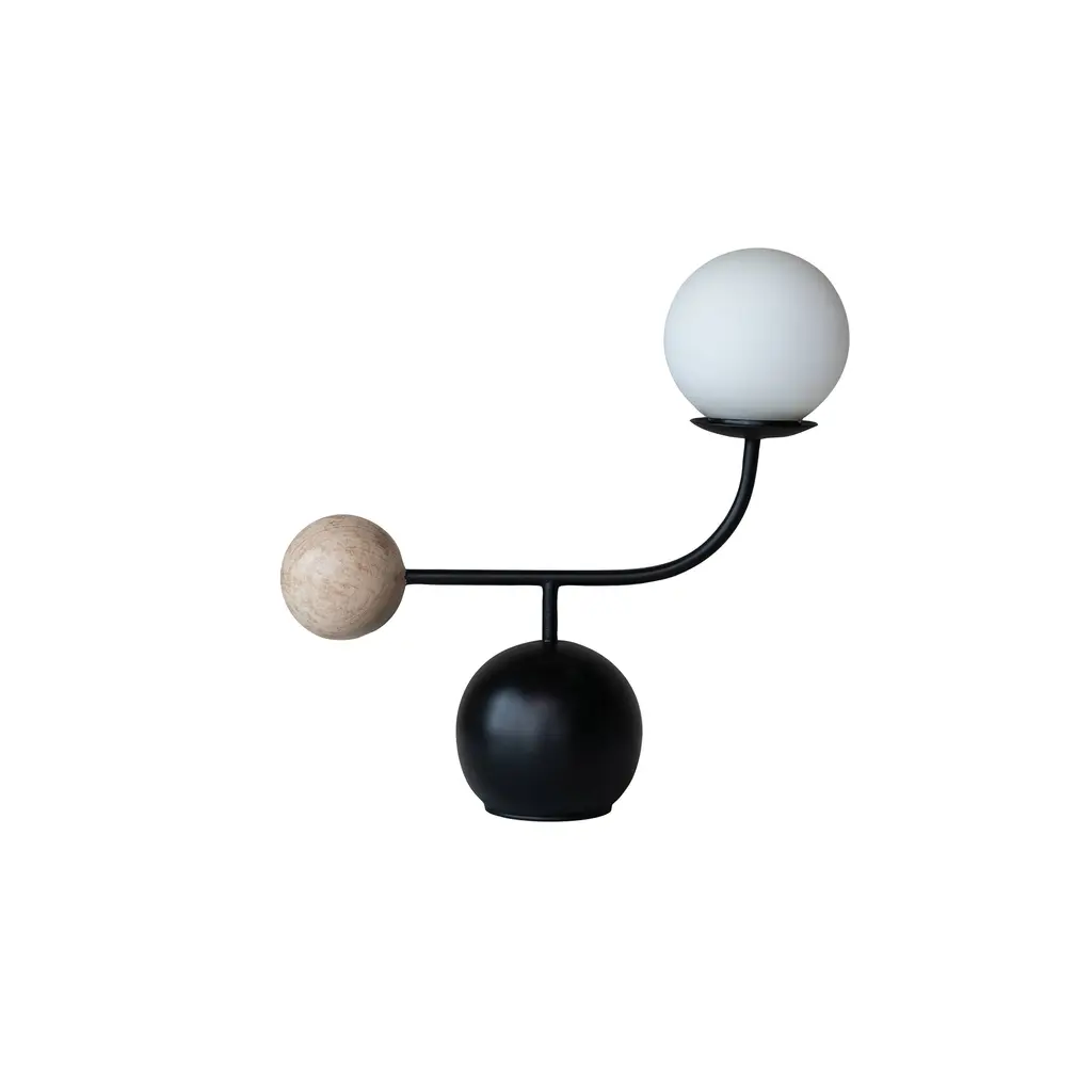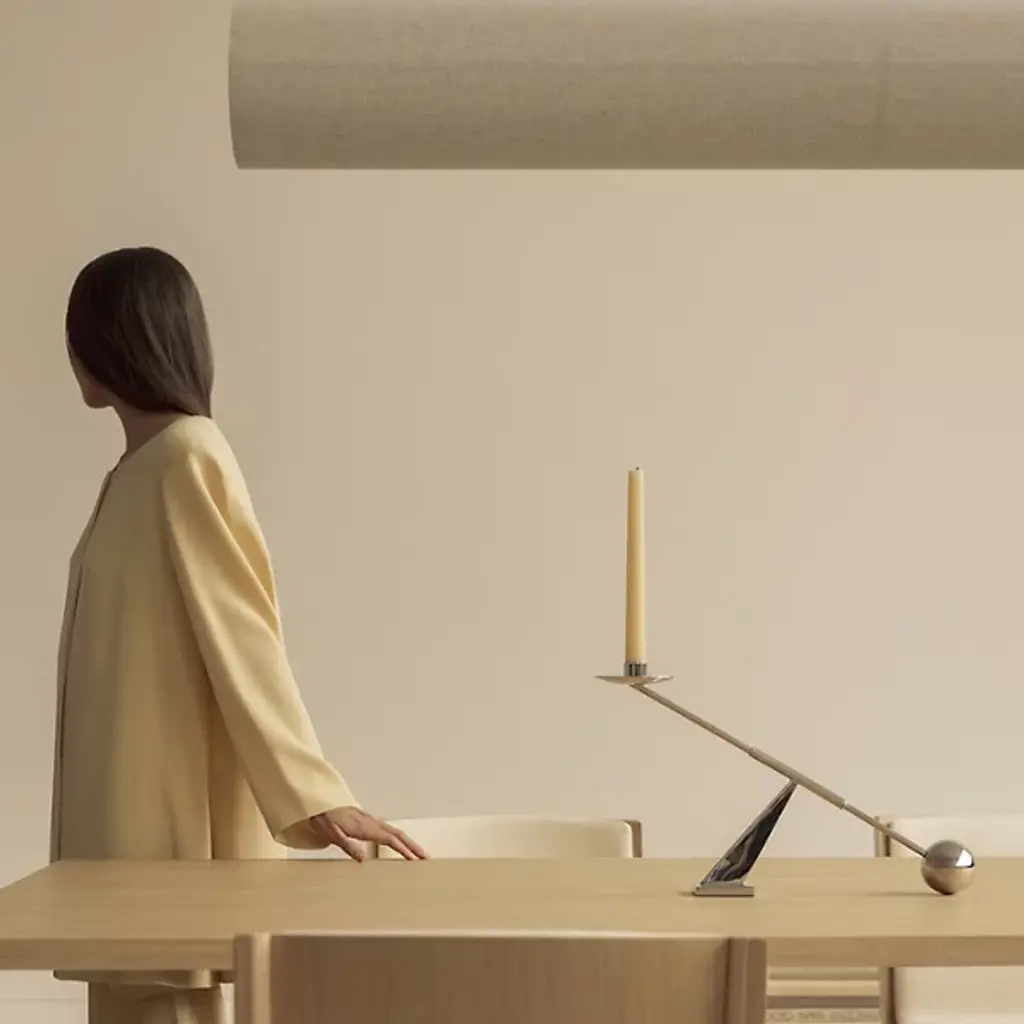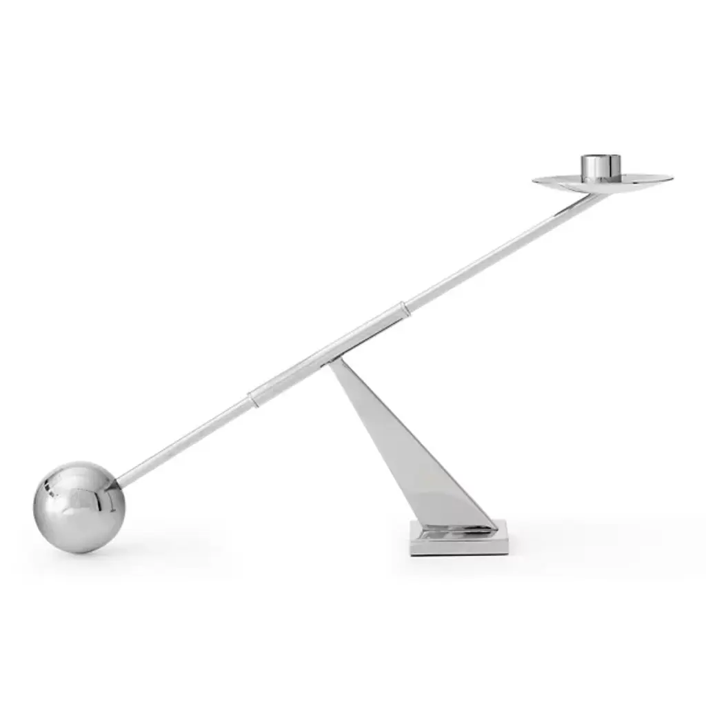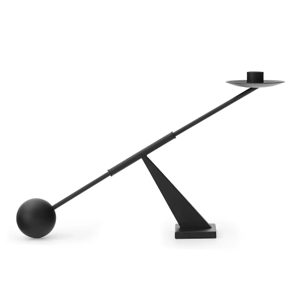 Add bright light and bold, balanced sculpture to interior spaces with the Interconnect Candle Holder from Audo Copenhagen. A mix of clean contemporary lines and essential Scandinavian simplicity designed by Colin King, it uses a simple geometric form to elevate an angular arm from a fin-shaped base, counterweighting an upright candle holder and bobeche with a sphere-shaped counterweight, easily able to work as a striking sculpture or as a functional candle holder that appears to float, burnishing its smooth metal surface when lit.