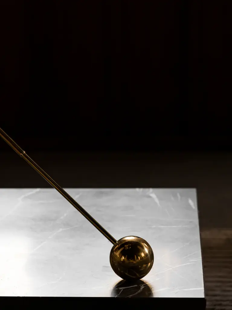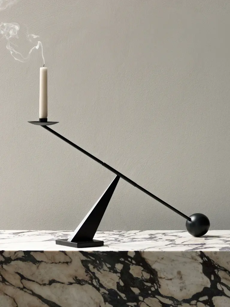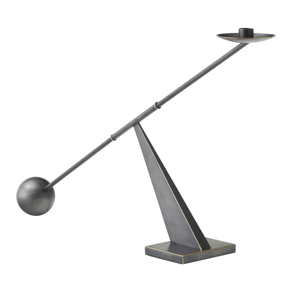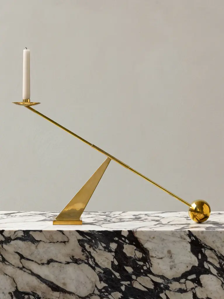 Interconnect Candle Holder is a bold and illuminating centerpiece of exaggerated proportions, designed for Audo by Colin King. As a source of cozy candlelight, it is characterized by its deceptively simple geometric form: a sphere, an angle and a line, which unite to create a unique design. Available in polished brass or painted steel, it goes beyond its intended use to function as a sculpture.