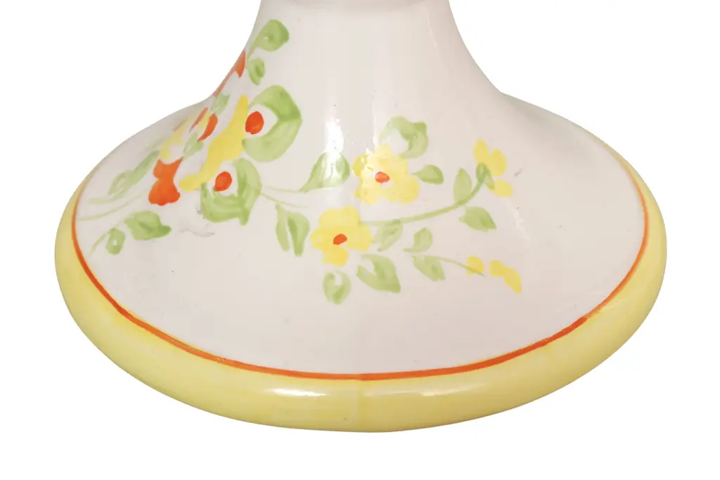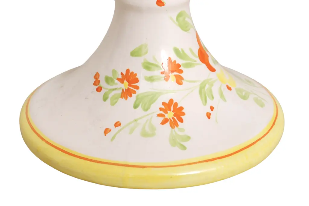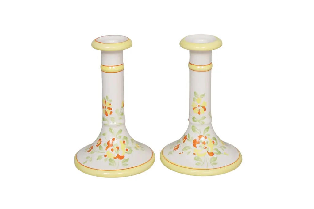 A pair of off-white ceramic candlestick holders. Brightly decorated with hand-painted flowers in orange and yellow. Made in Italy for Mill Pond House. Dimensions per candlestick.