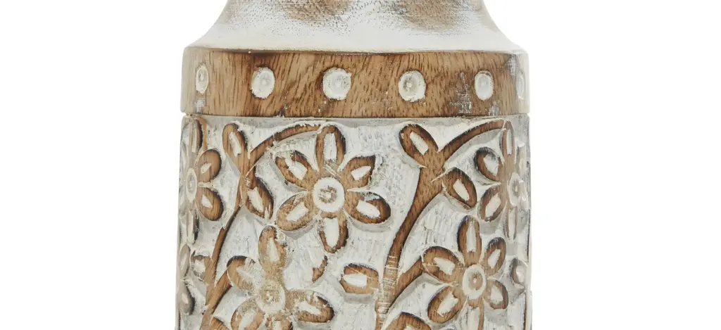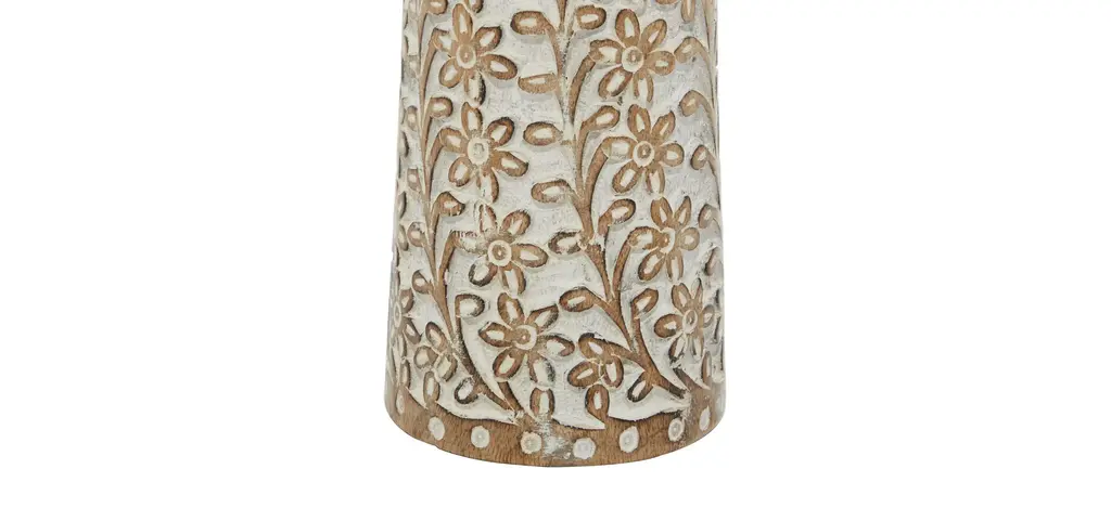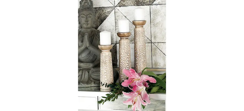 Infuse your space with the romantic candlelight glow that emits from this Ivy Collection Akinnuoye Candle Holder: Set of 3. Delight your guests and make any occasion extra special by adding a lighted or flameless candle. Made with a sturdy base, it is perfect for creating an elegant atmosphere on your table top or mantel. Designed with black rubber stoppers at the base that prevent scratching furniture and table tops, as well as sliding around. Each pillar style candle holder can accommodate one candle. Suitable for indoor use only. Each set comes with 3 carved wooden candle holders.
