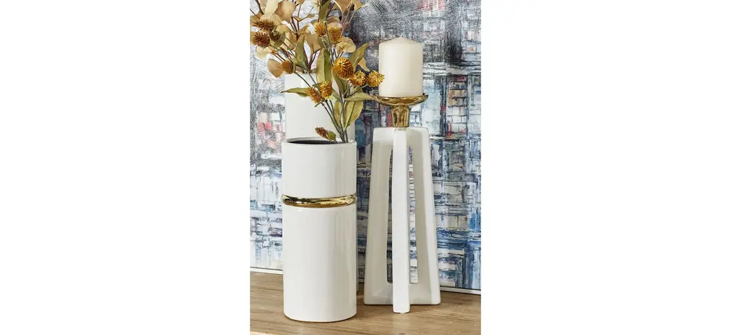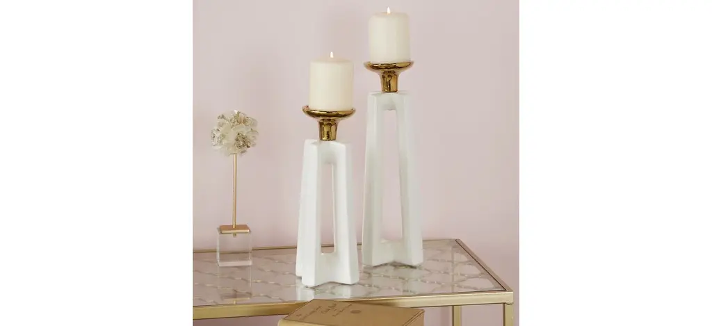 The versatile white and gold hues featured in the Ivy Collection Gallifreyan Candle Holders Set of 2 work with any style decor while adding a modern twist with their dimensional silhouettes and clean lines. Delight your guests and make any occasion extra special by adding a lighted or flameless candle. Made with a sturdy base, it is perfect for creating an elegant atmosphere on your table top or mantel. Designed with anti-slip rubber stoppers at the base that prevent scratching furniture and table tops. Each holder can accommodate one pillar candle. Suitable for indoor use only. Pair of modern style candle holders.