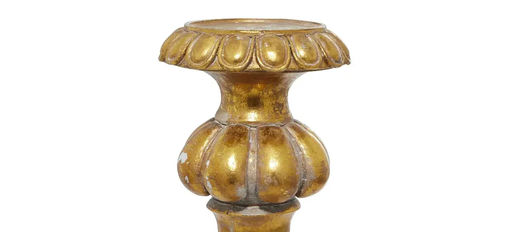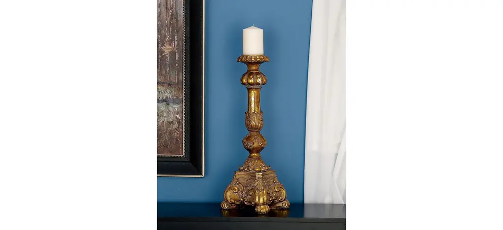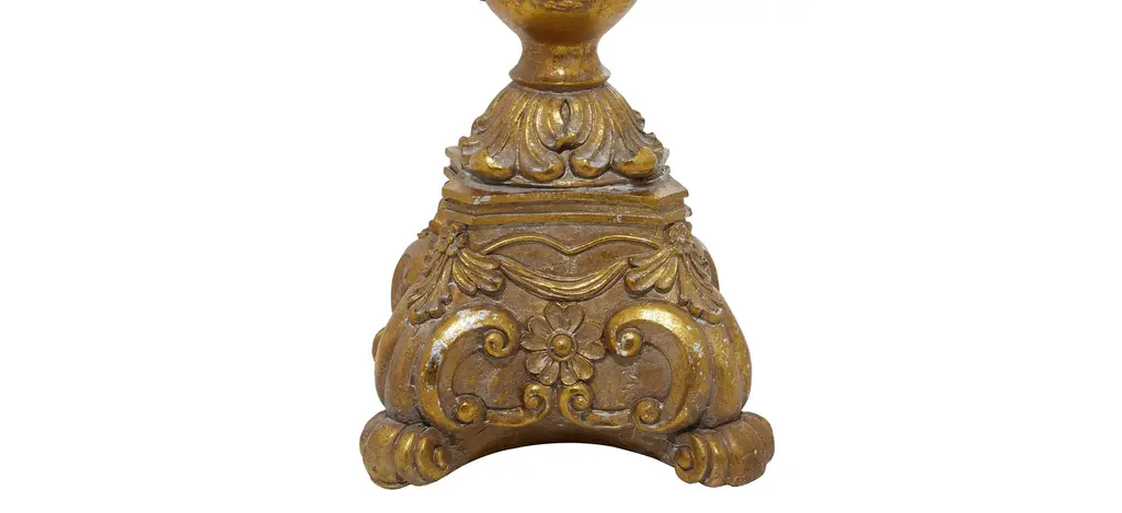 This antique-like Ivy Collection Hubert Candlestick Holder is a stunning focal point piece for renaissance-inspired homes and marble-finished fireplaces. Delight your guests and make any occasion extra special by adding a lighted or flameless candle to this candle holder centerpiece. Made with a sturdy base, it is perfect for creating an elegant atmosphere on your table top or mantel. Designed with rubber stoppers at the base that prevent scratching furniture and table tops, and hold it in place. This ceramic pillar candle holder can hold one candle. Scrollwork and floral designs add character. This item is suitable for indoor use.