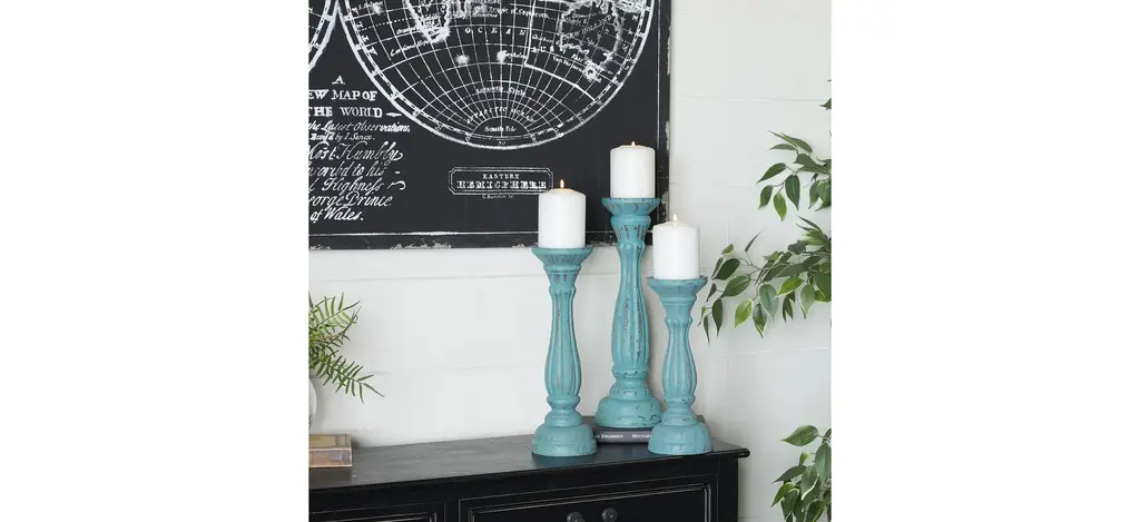 The Ivy Collection Kenyatta Candle Holders Set of 3 is the finishing touch you are looking for in your rustic and boho interiors. The architectural column-like silhouettes and carved ridges were crafted from wood with a distressed colorful hue. Use them as soft light holders in the dining area or as centerpieces on top of dressers and side tables. Designed with black rubber stoppers at the base that prevent scratching furniture and table tops, as well as sliding around. Each pillar candle holder can accommodate one votive or pillar candle. Suitable for indoor use only. This set includes 3 candle holder.