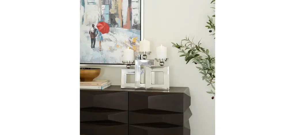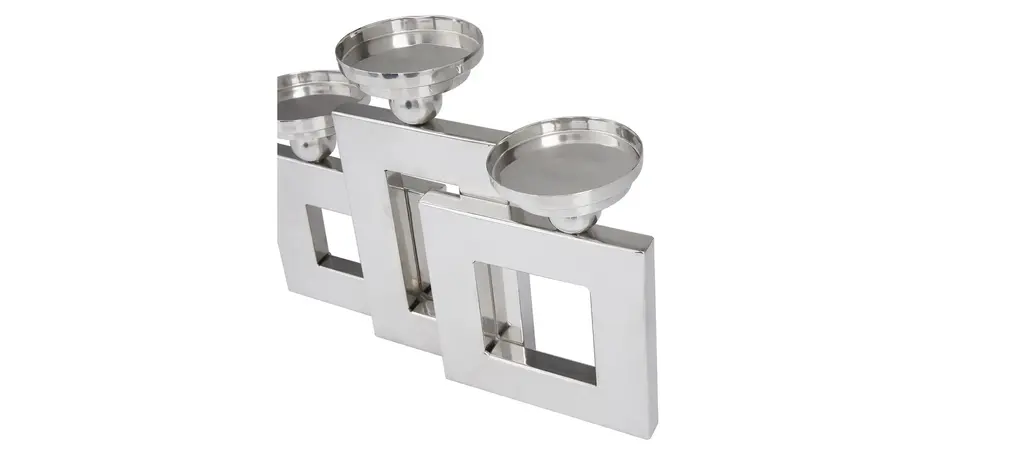 Infuse your space with the romantic candlelight glow that emits from this Ivy Collection Natsuki Candle Holder. Delight your guests and make any occasion extra special by adding a lighted or flameless candle to this candle holder centerpiece. Made with a sturdy base, it is perfect for creating an elegant atmosphere on your table top or mantel. Designed with black rubber stoppers at the base that prevent sliding around as well as scratching the floor. Each silver candle holder can accommodate a votive candle. Suitable for indoor use only.