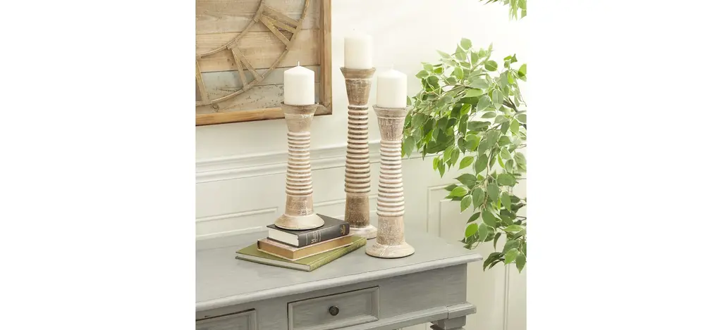 Add instant warmth and inviting ambiance to your home with this Ivy Collection Set of 3 Brown Wood Candle Holders that is a great addition to traditional interior. Delight your guests and make any occasion extra special by adding a lighted or flameless candle to this candle holder centerpiece. Made with a sturdy base, it is perfect for creating an elegant atmosphere on your table top or mantel. Designed with black rubber stoppers at the base that prevent scratching furniture and table tops, as well as sliding around. Each pillar style candle holder can accommodate one candle. Suitable for indoor use only. This is a three-piece candle holder set.