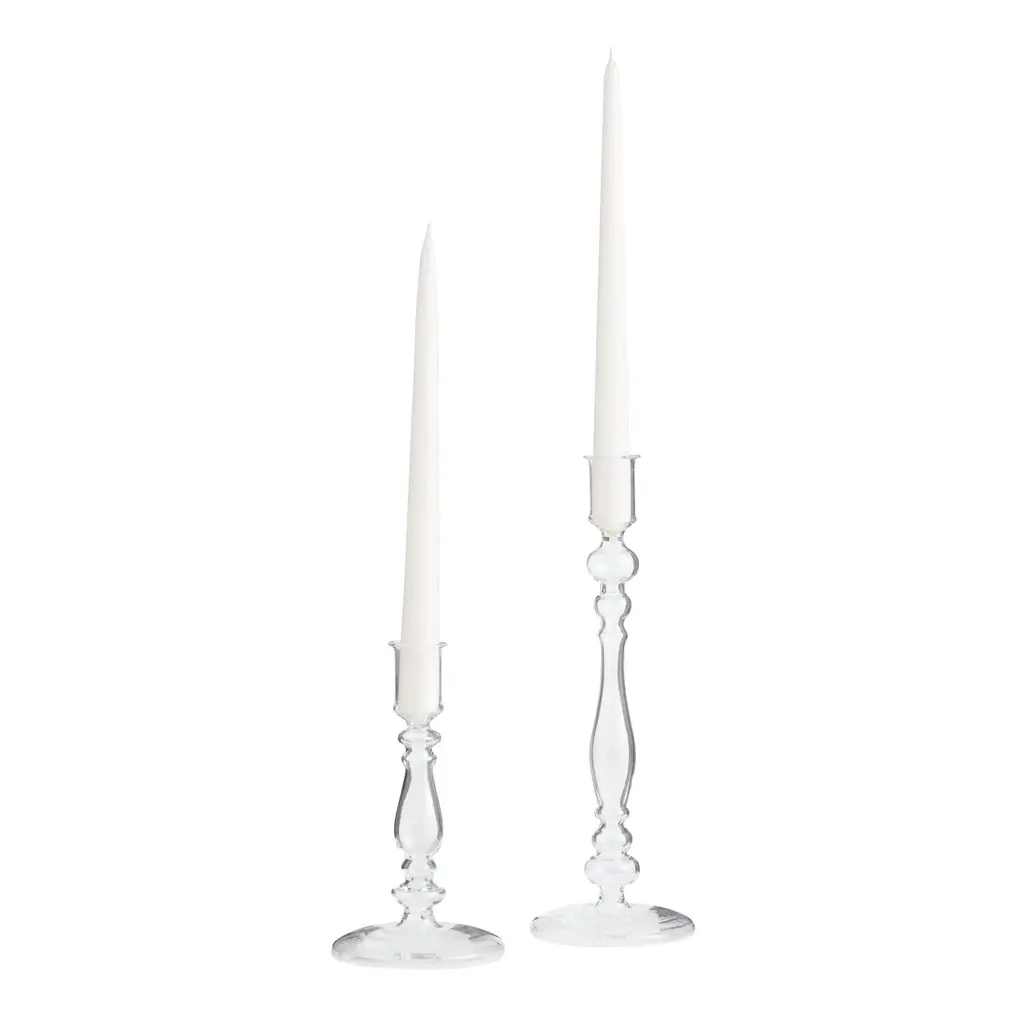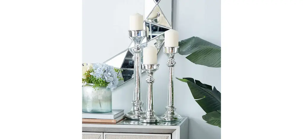 Infuse your space with the romantic candlelight glow that emits from this Ivy Collection Set of 3 Silver Glass Candle Holders. Delight your guests and make any occasion extra special by adding a lighted or flameless candle to this candle holder centerpiece. Made with a sturdy base, it is perfect for creating an elegant atmosphere on your table top or mantel. Suitable for indoor use only. This is a three-piece candle holder set. Vintage inspired. Each tapered style pillar candle holder can accommodate one pillar candle.
