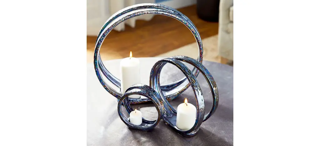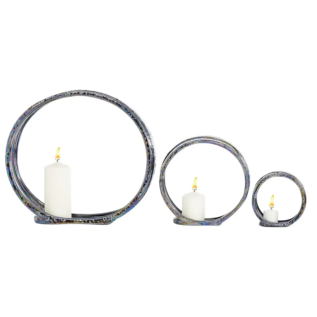 Infuse your space with the romantic candlelight glow that emits from this glam Ivy Collection Silver Ceramic Candlestick Holder. Delight your guests and make any occasion extra special by adding a lighted or flameless candle to this candle holder centerpiece. Made with a sturdy base, it is perfect for creating an elegant atmosphere on your table top or mantel. Designed with black rubber stoppers at the base that prevent scratching furniture and table tops, as well as sliding around. Suitable for indoor use only. Trio of circular iridescent silver candle holders. Each pillar candle holder can accommodate one various pillar candle.
