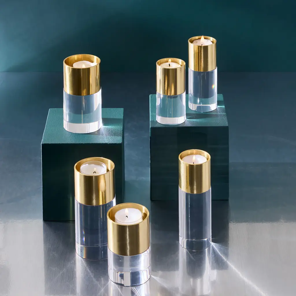 Clearly Cool. Our Jacques Candle Holder Set is the perfect blend of simplicity and glamour, modern and traditional. Featuring solid acrylic bases accented with polished brass tops. Available in a chic clear or a bold primary colorway for a modern glow to match any mood.