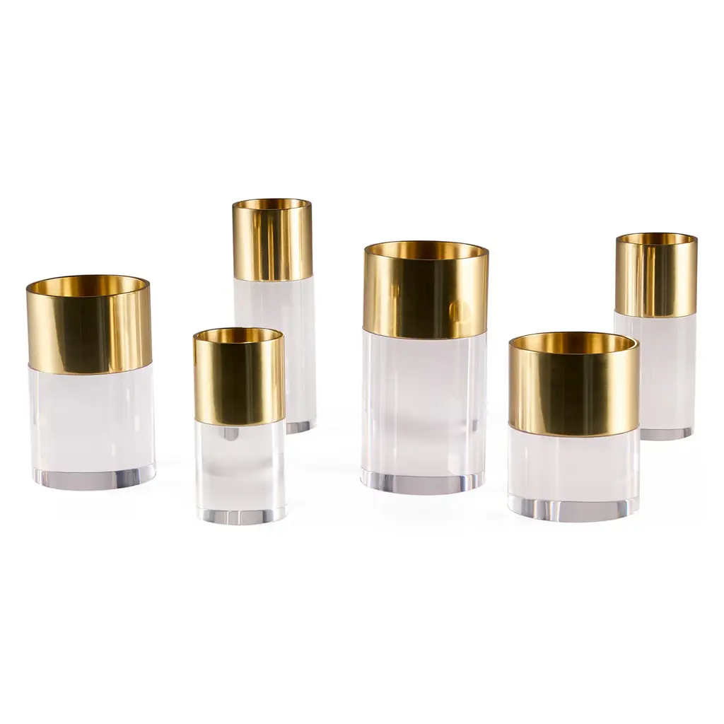 Clearly Cool. Our Jacques Candle Holder Set is the perfect blend of simplicity and glamour, modern and traditional. Featuring solid acrylic bases accented with polished brass tops. Available in a chic clear or a bold primary colorway for a modern glow to match any mood.