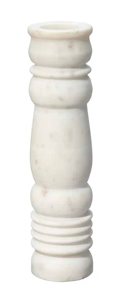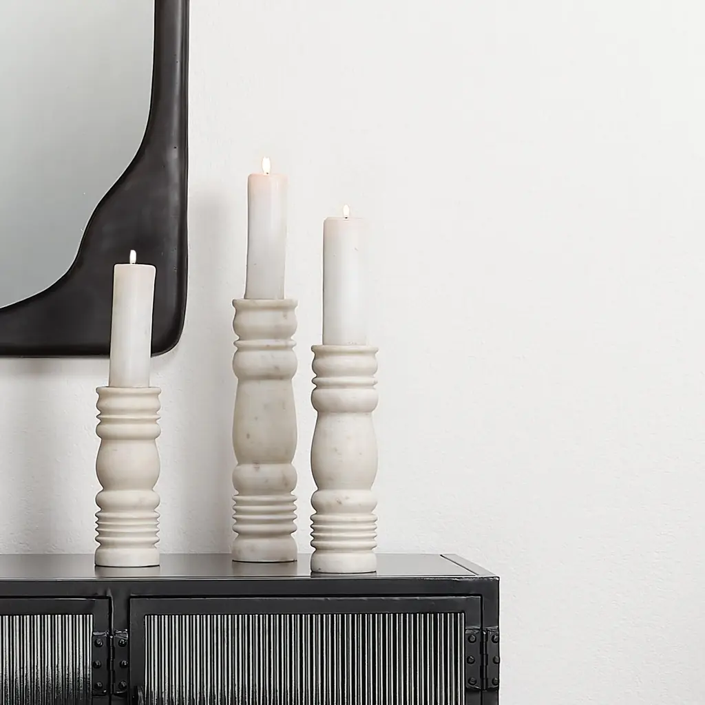 Beautifully artisan-carved of cool white stone, this set of three candlesticks pair classical inspirations with modern elegance. Whether used with your favorite tapers to light a special dinner or displayed on a mantel, this set is the perfect way to add the glow of candlelight to your home. Materials: Marble
