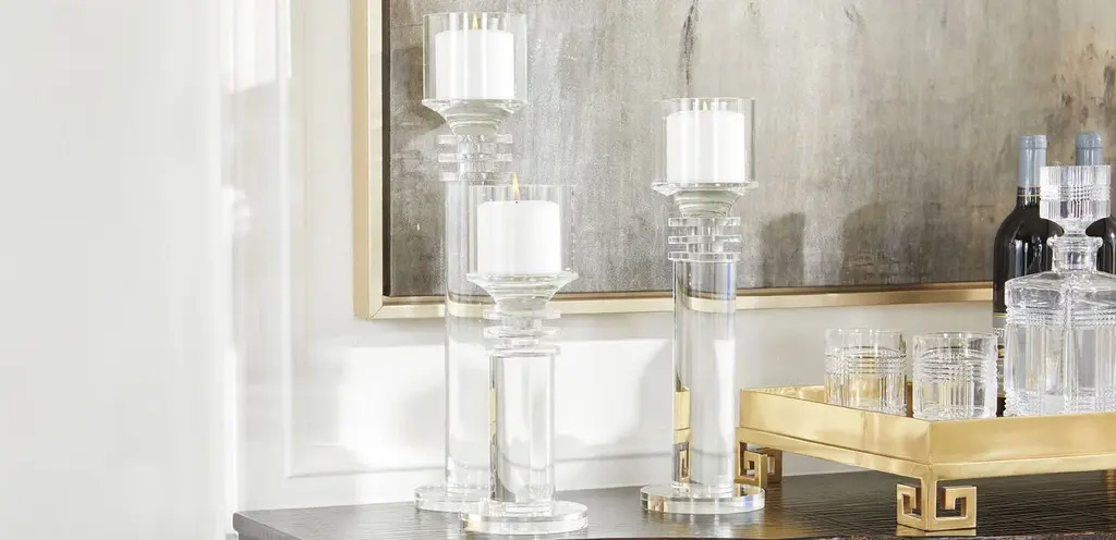 Neoclassical influences sparkle throughout each Janna pillar candleholder. These decorative candleholders borrow their shape from the pillars and columns of the old world, but they're rendered in lead-free crystal for modern elegance. Use these transitional column candleholders anywhere, from your glamorous, Hollywood Regency-inspired dining room to your midcentury living room to your romantic bedroom retreat.