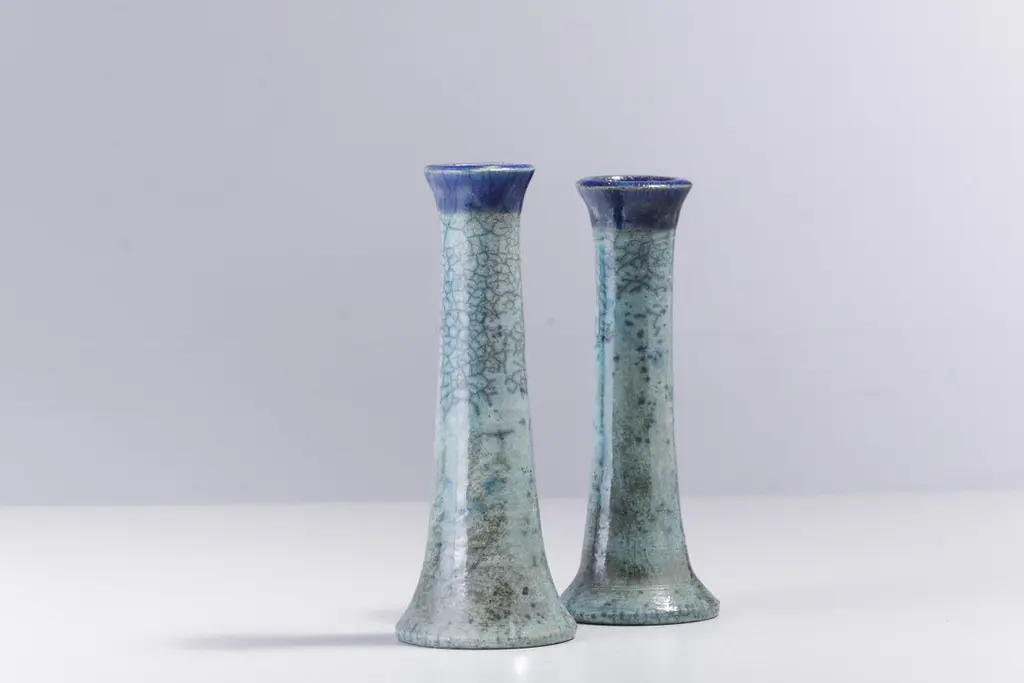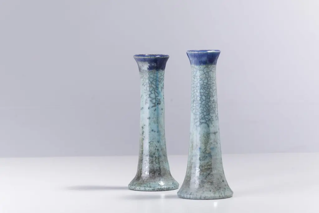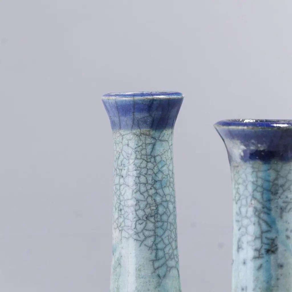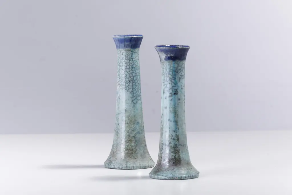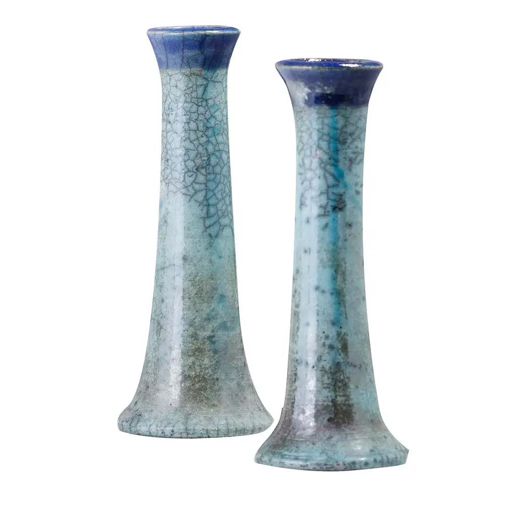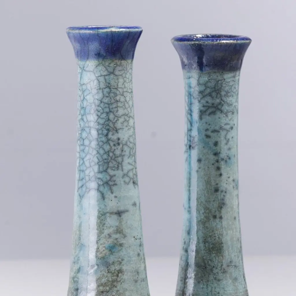 Japanese Laab 2 Stelo Candle Holders Raku Ceramic Blue