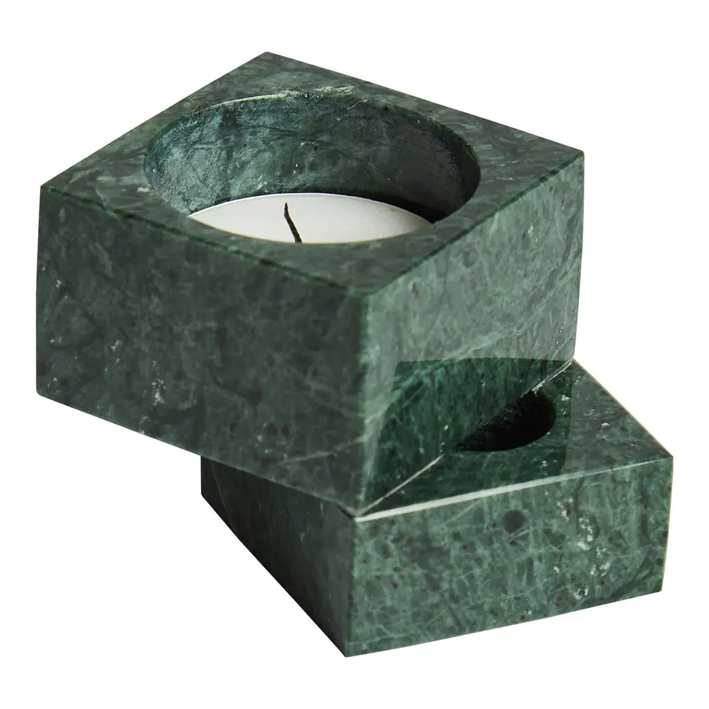 The Jeu de des candle holders demonstrate true versatility by showcasing a surprising interplay of smooth geometric shapes. With their various opportunities for adding different candles or using them as an aesthetic sculpture, the elegant objects allow you to have a playful approach while styling them to personalise your own composition. Combine the different sizes, turn them as you like and let them create a homely feel in the room, making them admirable accessories for your shelves or coffee table. The small candle holders are available in three sizes and three colours. Timeless black, contemporary brown and vibrant green. All natural marble shades.