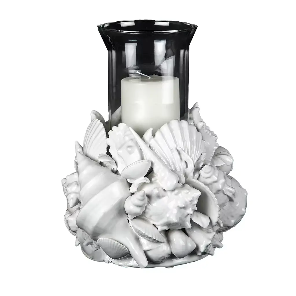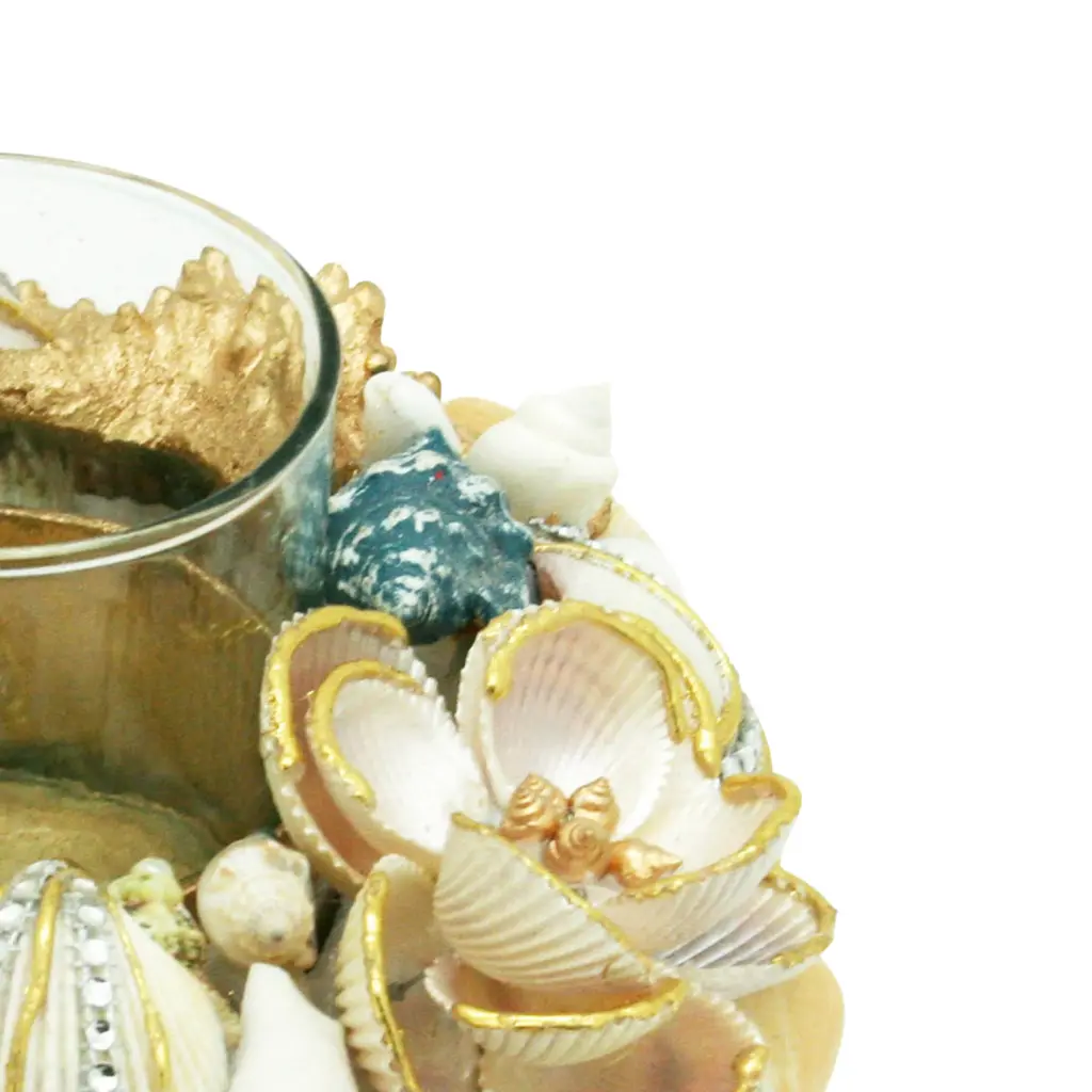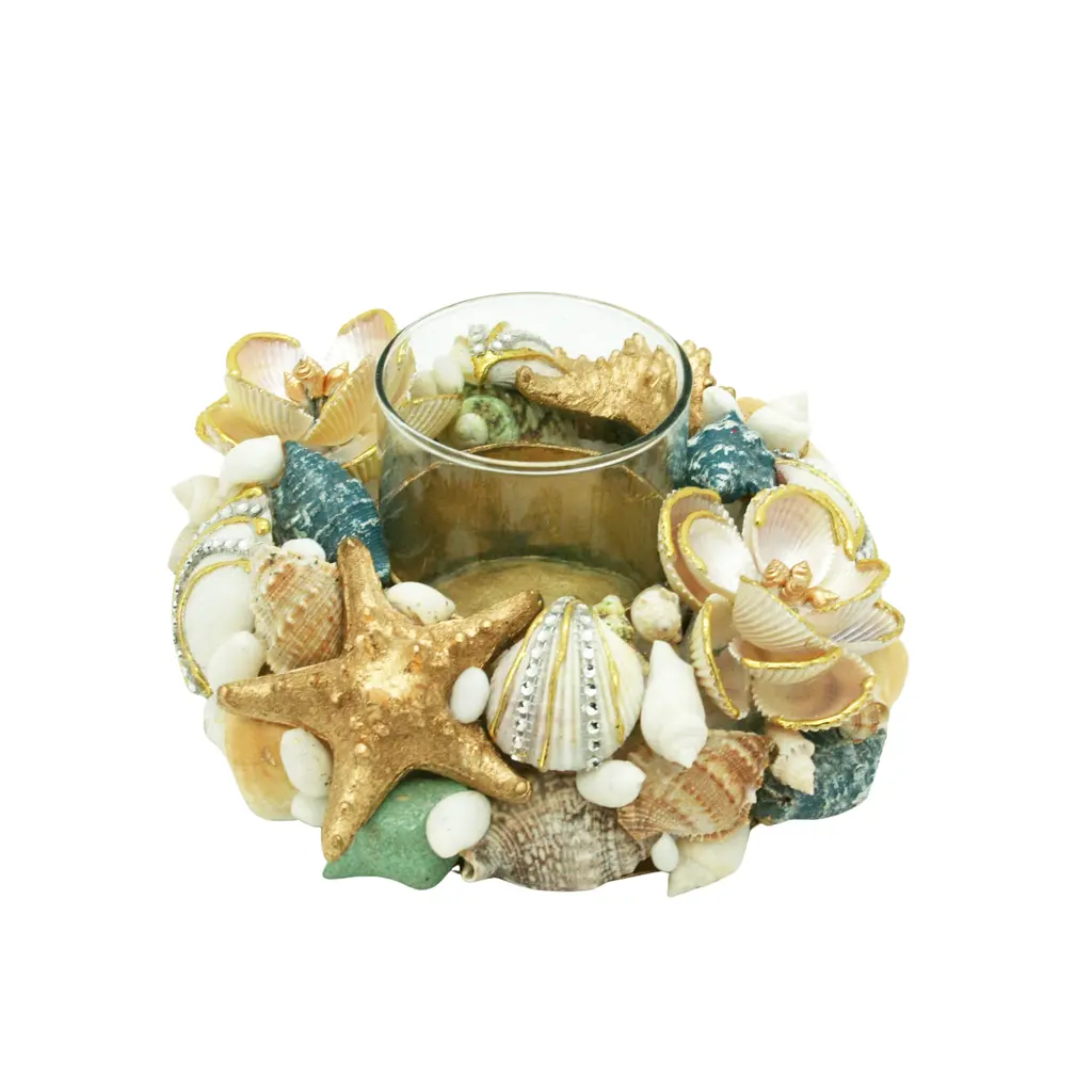 Add a touch of coastal elegance to your space with this handcrafted candle holder, where ocean-inspired textures meet refined detail. Real seashells in soft ivory tones are arranged around the base, accented with layered shades of blue and hints of gold for a serene yet sophisticated palette. The combination evokes the shimmer of sunlit waves and the richness of seaside treasures.