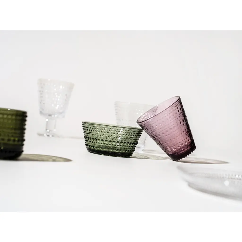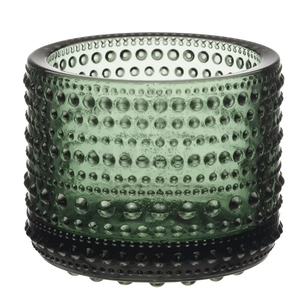 Iittala's Kastehelmi tealight holder is part of the popular glass collection designed by Oiva Toikka. The candle holder is adorned with the charming color of pine green, a shade that both illustrates the northern forests and is a perfect example of Iittala's exceptional color skills at the same time. In 1964, Toikka aimed to design a pattern that would conceal the joint marks in pressed glass. The result was Kastehelmi, Finnish for dewdrop, which features delicate glass droplets arranged in a series of rings. Kastehelmi became one of Toikka's most beloved series of glassware and it was manufactured until 1988. The most popular items were brought back to Iittala's production in 2010. Kastehelmi plays with light in the most beautiful way and suits any table setting.