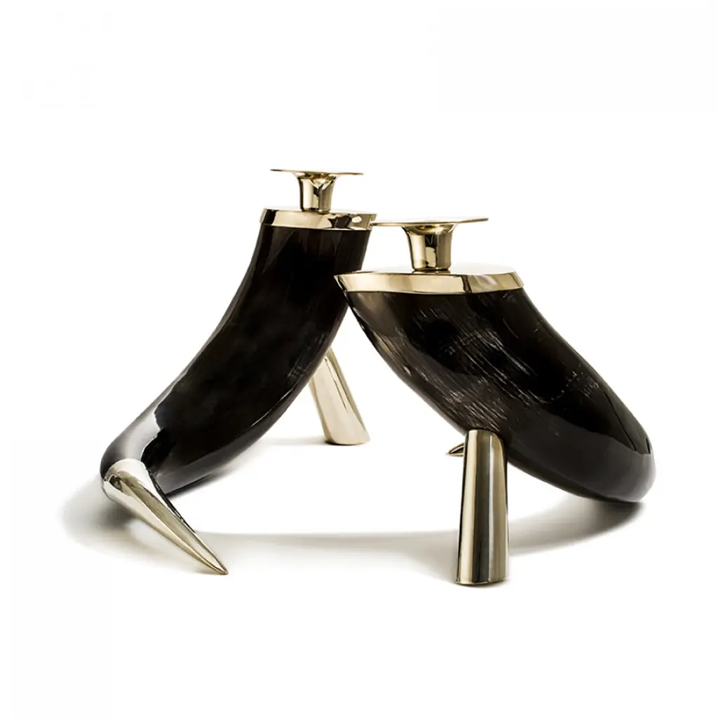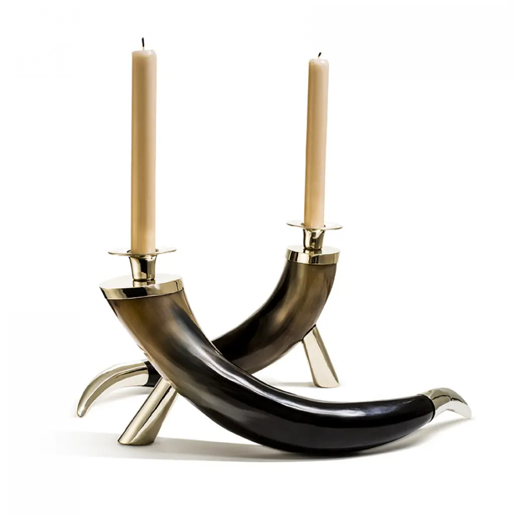 - Handcrafted set of 2 large polished bull horn candleholder finished with German Silver accents