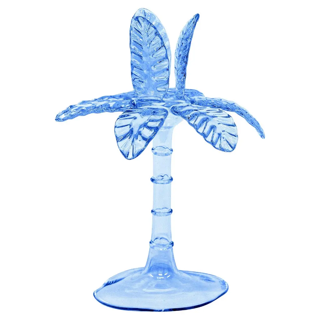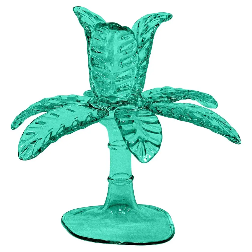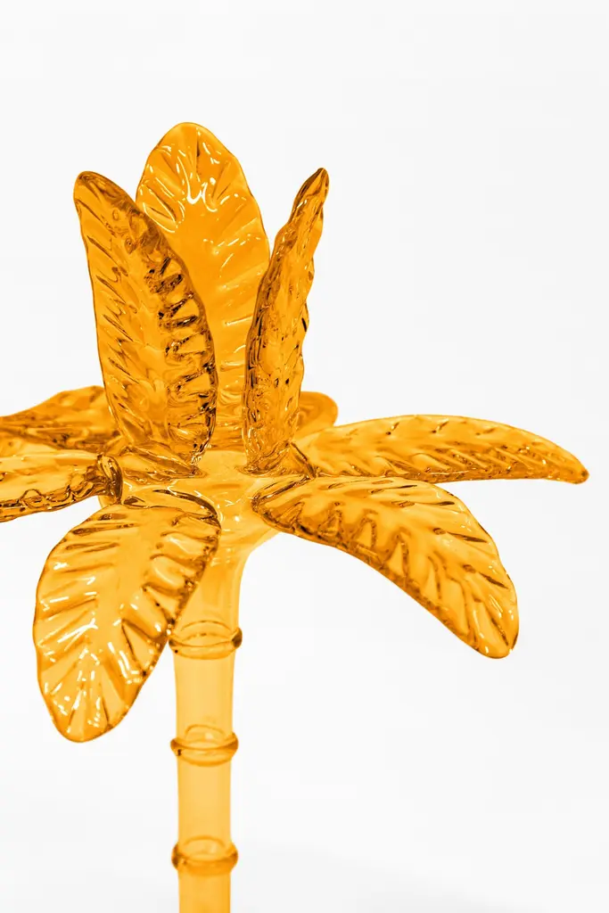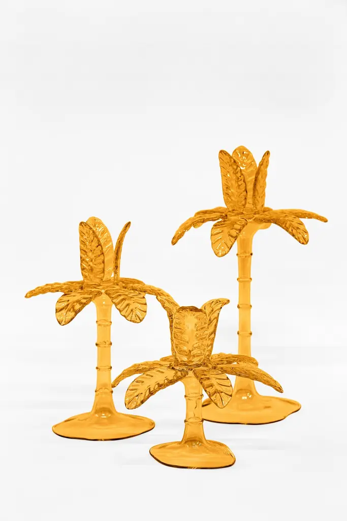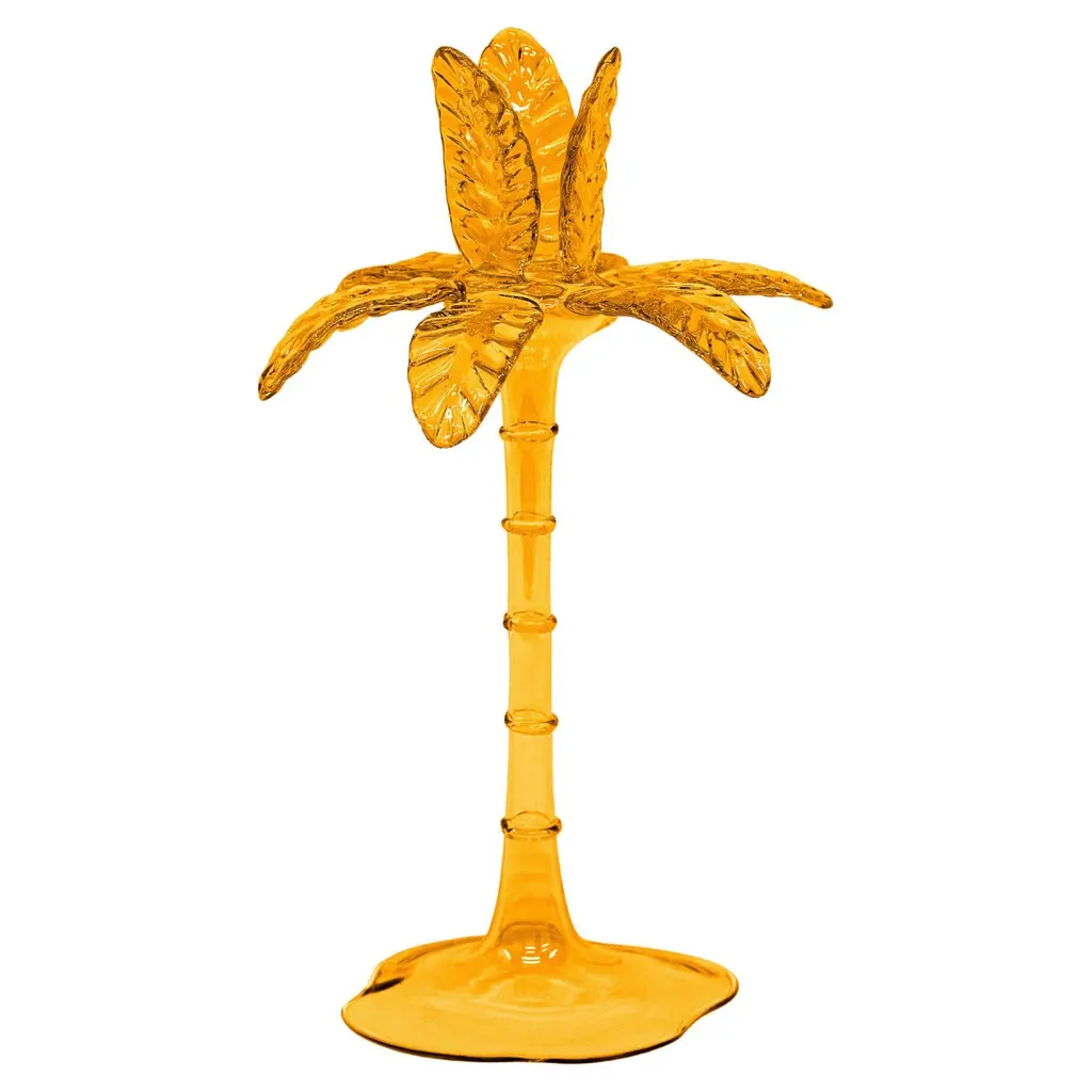 Precious candlestick in blown glass by Venetian artisans. The particular palm shape is a tribute to the exotic world, with a solid base, a slender stem and incredible detailed leaves.Available in three heights and seven colors, it is a versatile and striking piece of furniture.Designed by Vito Nesta.Amber 23cm palm.