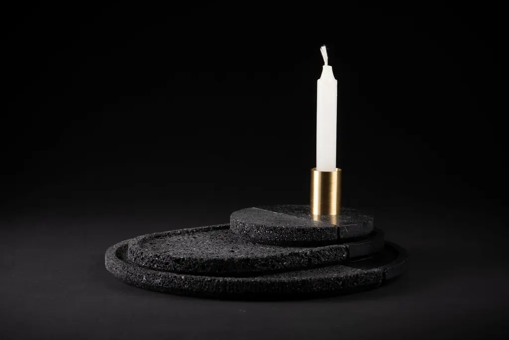 Volcanic stone is a witness to the power of nature: hand-polished by craftsmen with a millenary tradition, its unruly nature is transformed into a sensible and human object. With their dual texture, the collection of lava plates is as much an homage to Mexican tradition as it is a glance in the direction of modernity. A brass accent completes the harmonious balance and reveals that Lava candleholder is as decorative as it's functional. Materials: Volcanic Stone and Brass Measurements:14 cm x 14 cm x 2 cm.