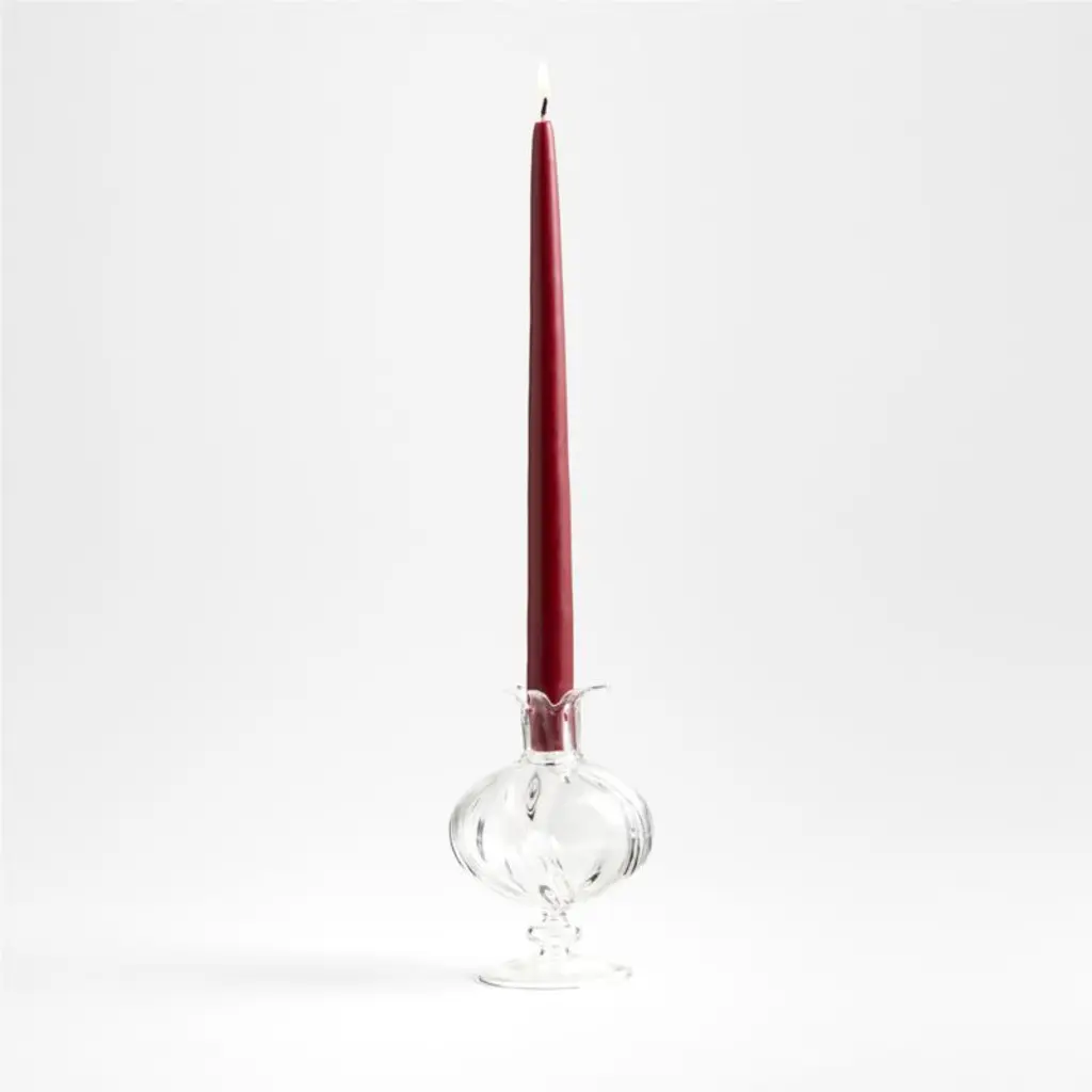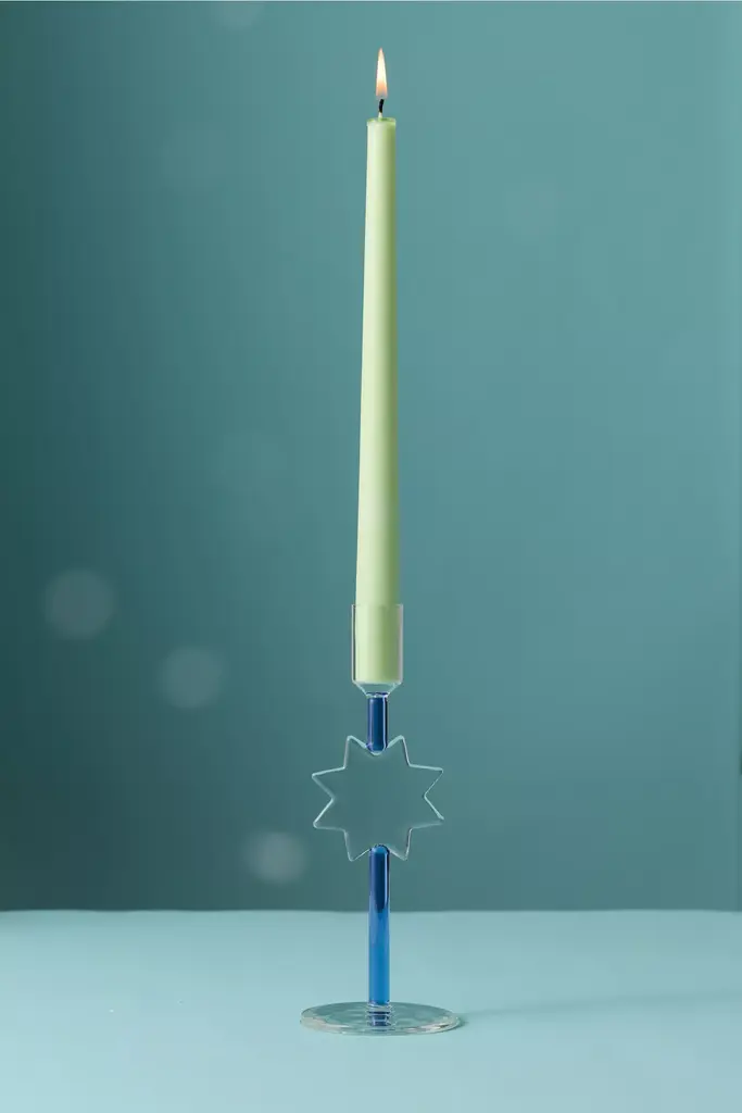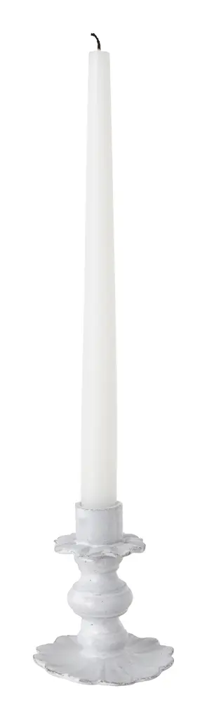 Decorative hand made ceramic candlestick with satin brass wax collector and 4 scented candles set Lavanda e Iris. Immerse yourself in the magic of a candlelit dinner with the delicate Lavender and Iris fragrance. The candlestick comes in a gift box that includes the set of 4 scented candles, made of recycled cardboard from certified sources