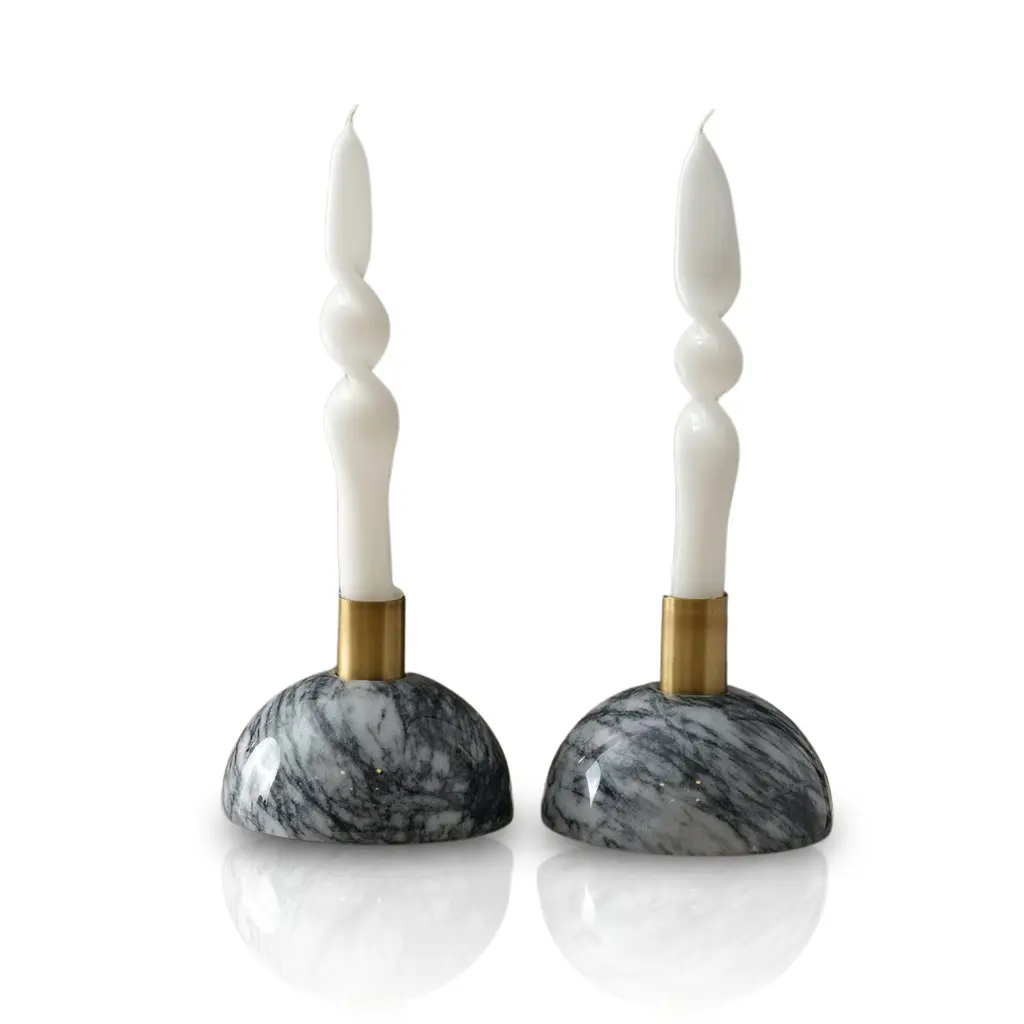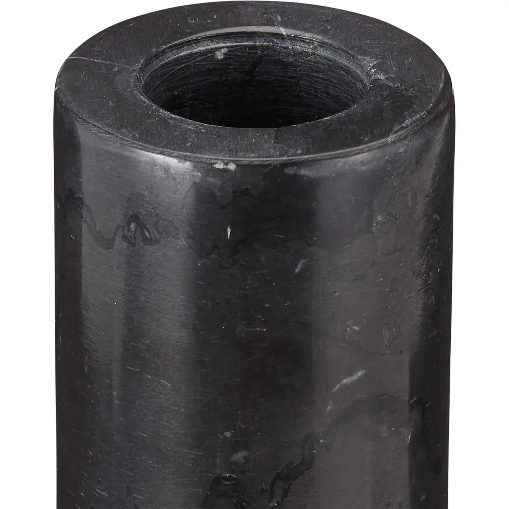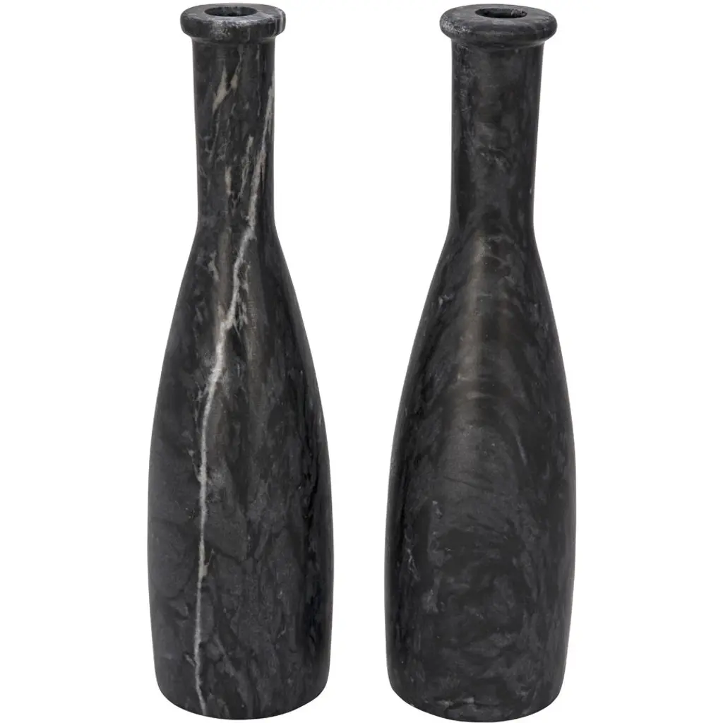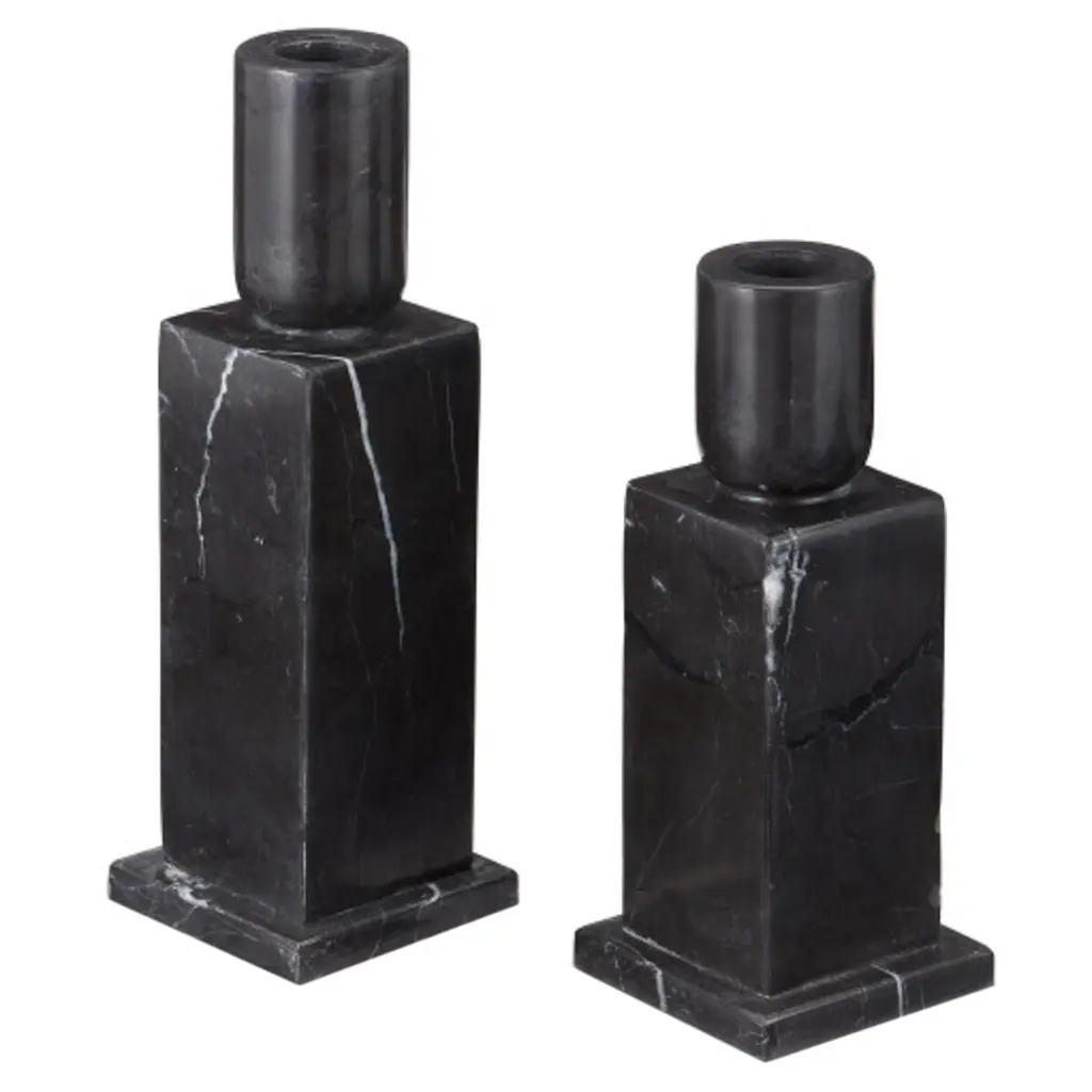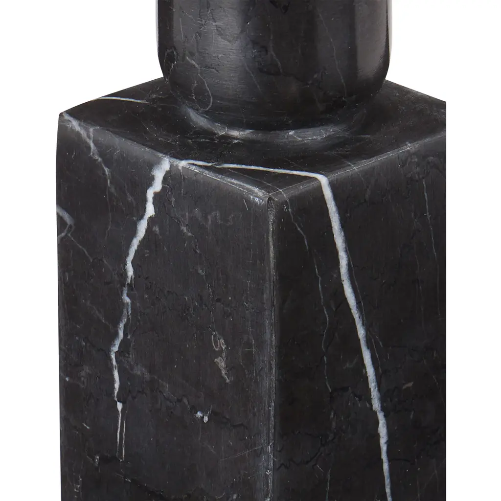 The Lithos Black Candle Holder Set includes two candle holders made of black marquina marble. The geometric shapes that comprise its profile are enlivened by the natural veining of the stone, making each one unique. The characteristics of this stone bring a deep black and crisp white interplay to their surfaces.