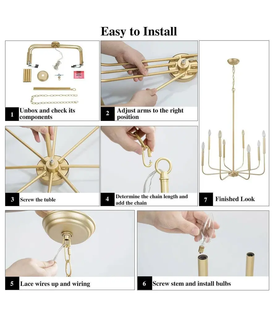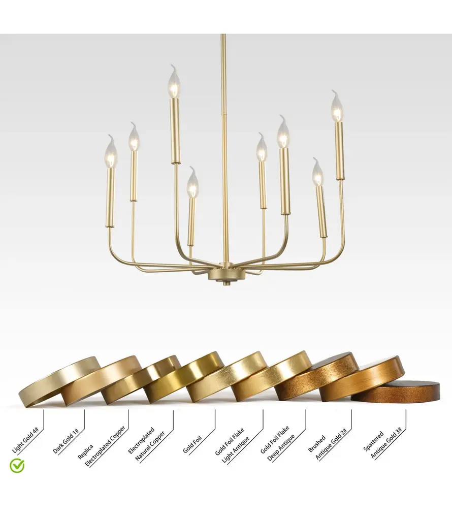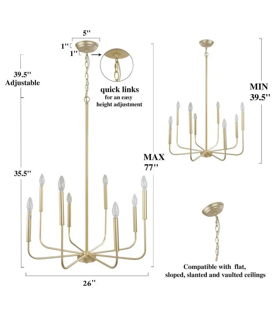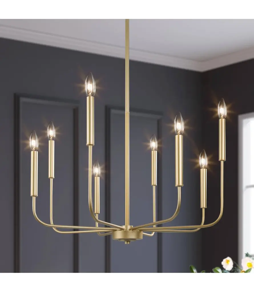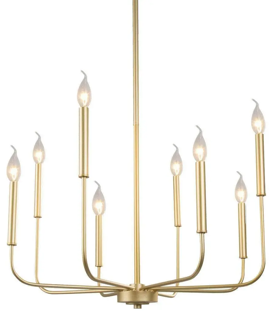 Light up your cozy home with a sense of modern flair with this 8-light gold chandelier from LNC lighting. Crafted from metal, its frame strikes a classic simple candle-style silhouette. What makes this chandelier special is the non-ordinary candle style without cups!Classic simple candle-style adds a modern look and elegant feel to your space fits traditional abodes and modern farmhouses.Eight 40W candelabra-base bulbs (not included) are exposed atop the arms, casting warm, inviting light to illuminate your living spaces. For energy efficiency, LED candelabra bulbs are recommended (4W/bulb).Ideal for dining rooms, living rooms, or entryways, this chandelier enhances your space with its perfect balance of vintage charm and modern sophistication.FeaturesModel: HA03622Material: Metal, GlassColor: GoldStyle: Modern/contemporaryFinish: MatteProduct Dimension: 26"D x 26"W x 37.5"H (exclude the hanging height)Canopy Dimension: 5"D x 1"HShade Material: MetalShade Color: GoldShade Shape: CandleCompatible ceiling types: flat, sloped, slanted and vaulted ceilingsType of Drop: Downrod/ChainHeight/Vertically Adjustable: YesMaximum Hanging Height: 76.5"Minimum Hanging Height: 37.5"Adjustable Height: YesLocation: DryDimmable: Yes, when used with dimmer switch and dimmable bulbsKey Features:Bulb Type: B10 Flame, Incandescent/LEDBulb Base: E-12Maximum Wattage: 40W (4W for LED)Number of Bulb: 5Bulb Included: Not IncludedVoltage: 120VMount Type: Ceiling MountAssembly Required: YesMounting Accessory Included: YesPower Source: HardwiredProfessional installation recommended