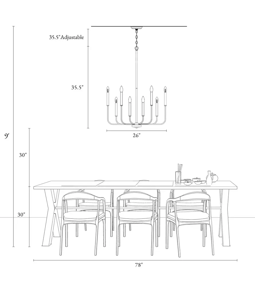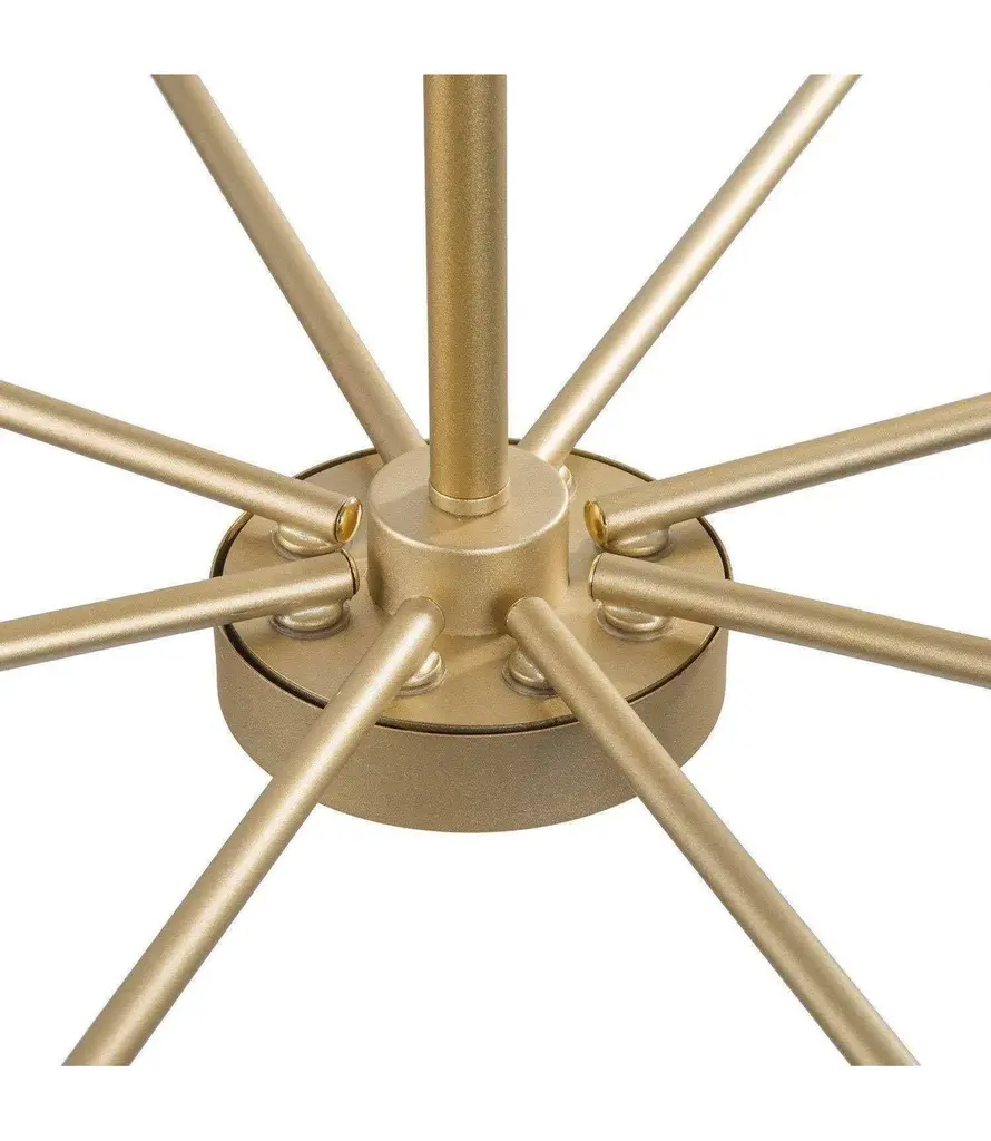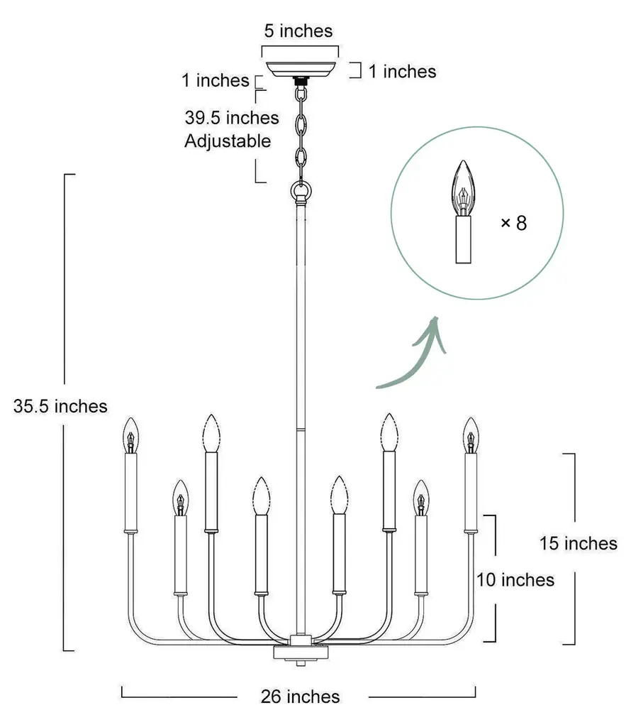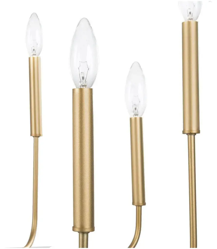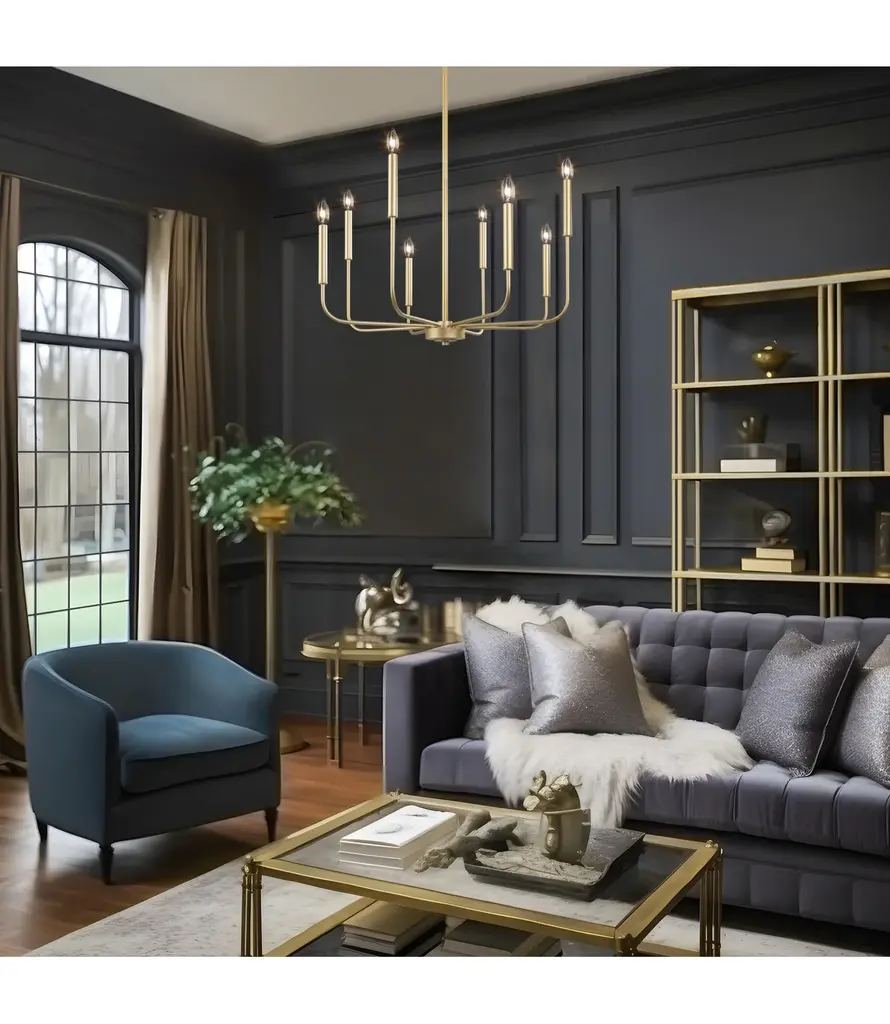 Light up your cozy home with a sense of modern flair with this 8-light gold chandelier from LNC lighting. Crafted from metal, its frame strikes a classic simple candle-style silhouette. What makes this chandelier special is the non-ordinary candle style without cups!Classic simple candle-style adds a modern look and elegant feel to your space fits traditional abodes and modern farmhouses.Eight 40W candelabra-base bulbs (not included) are exposed atop the arms, casting warm, inviting light to illuminate your living spaces. For energy efficiency, LED candelabra bulbs are recommended (4W/bulb).Ideal for dining rooms, living rooms, or entryways, this chandelier enhances your space with its perfect balance of vintage charm and modern sophistication.FeaturesModel: HA03622Material: Metal, GlassColor: GoldStyle: Modern/contemporaryFinish: MatteProduct Dimension: 26"D x 26"W x 37.5"H (exclude the hanging height)Canopy Dimension: 5"D x 1"HShade Material: MetalShade Color: GoldShade Shape: CandleCompatible ceiling types: flat, sloped, slanted and vaulted ceilingsType of Drop: Downrod/ChainHeight/Vertically Adjustable: YesMaximum Hanging Height: 76.5"Minimum Hanging Height: 37.5"Adjustable Height: YesLocation: DryDimmable: Yes, when used with dimmer switch and dimmable bulbsKey Features:Bulb Type: B10 Flame, Incandescent/LEDBulb Base: E-12Maximum Wattage: 40W (4W for LED)Number of Bulb: 5Bulb Included: Not IncludedVoltage: 120VMount Type: Ceiling MountAssembly Required: YesMounting Accessory Included: YesPower Source: HardwiredProfessional installation recommended