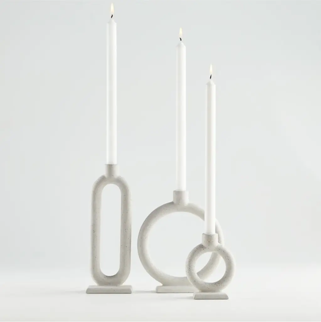 Concrete goes light and airy in a looped candle holder with a sculptural presence. Tall and slender, Lorin rises gracefully from a slim base to elevate a taper. Subtle texturing gives the large white candlestick the look and feel of an artisan creation. With its industrial beauty, the minimalist taper holder makes a statement displayed on its own or grouped with the other pieces in our exclusive Lorin collection for an interlocked look.
