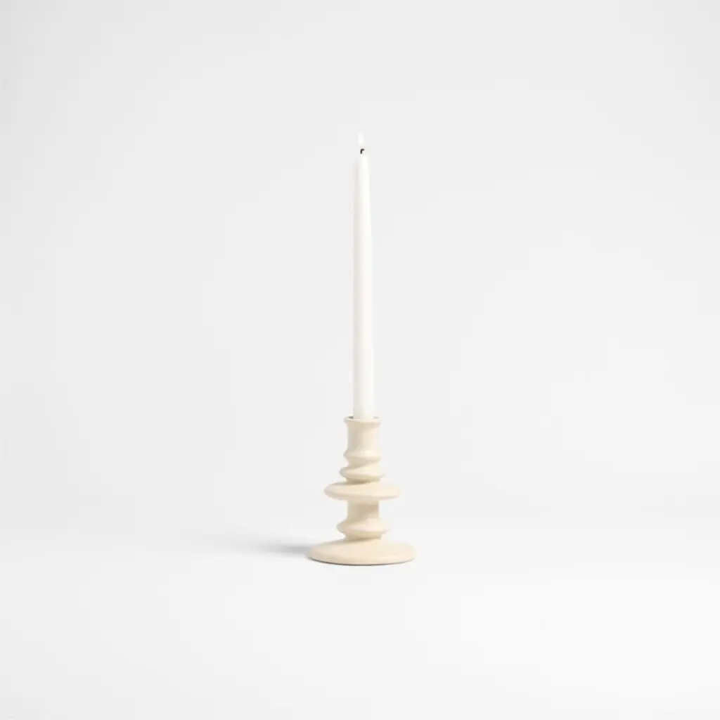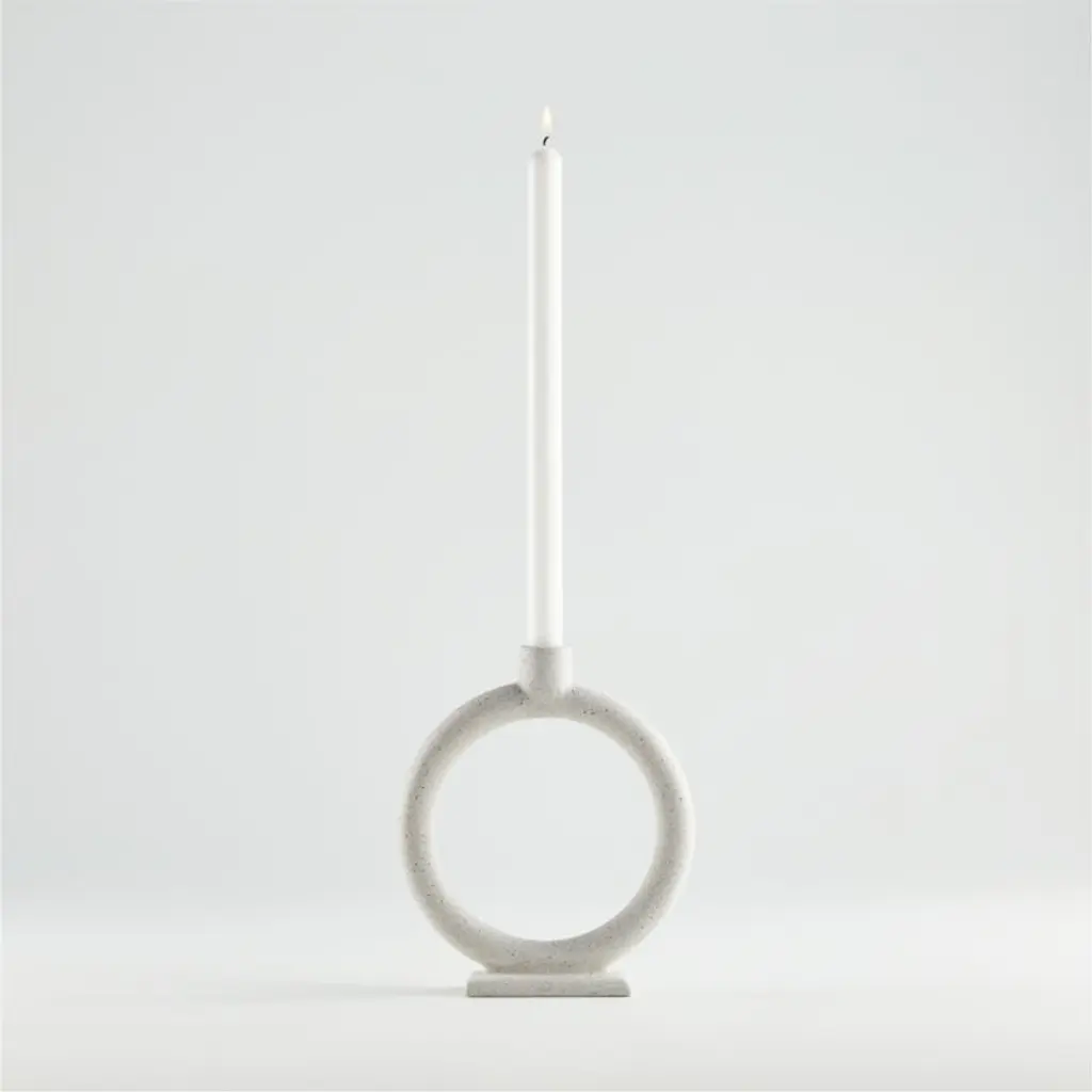 Concrete goes light and luxe in a looped candle holder with a sculptural presence. Like a bold bangle, Lorin curves an airy circle that elevates a taper. Subtle texturing gives the minimalist white candlestick the look and feel of an artisan creation. With its industrial beauty, the small taper holder makes a statement displayed on its own or grouped with the other pieces in our exclusive Lorin collection for an interlocked look.
