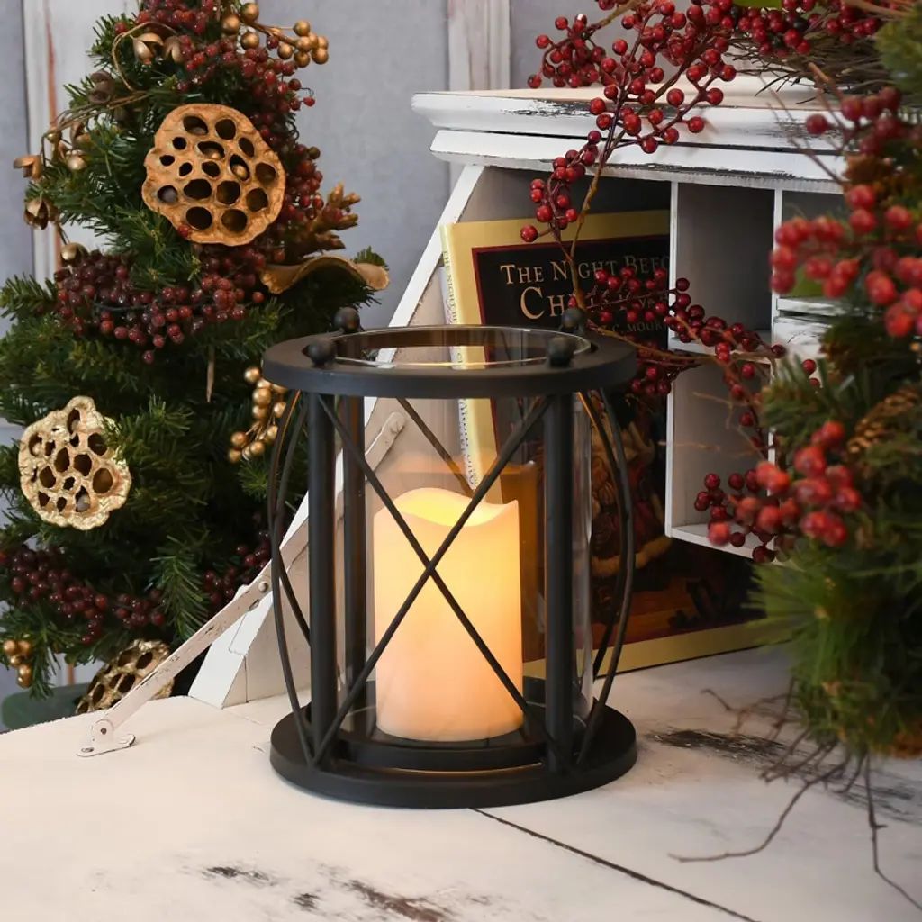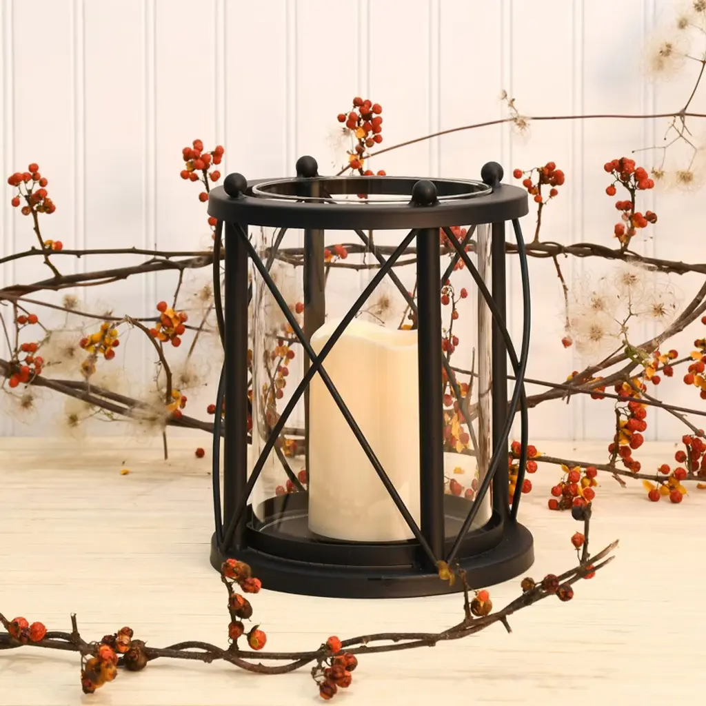 This beautifully crafted black metal hurricane with a crisscross design includes a glowing flameless pillar candle with a timer. The chic style makes it ideal for any occasion and everyday home décor. The amber pillar LED candle features a 5 hour on/19 hour off timer. The glass cylinder can be removed, making it easy for you to clean. Candle requires 3 AAA batteries (not included).