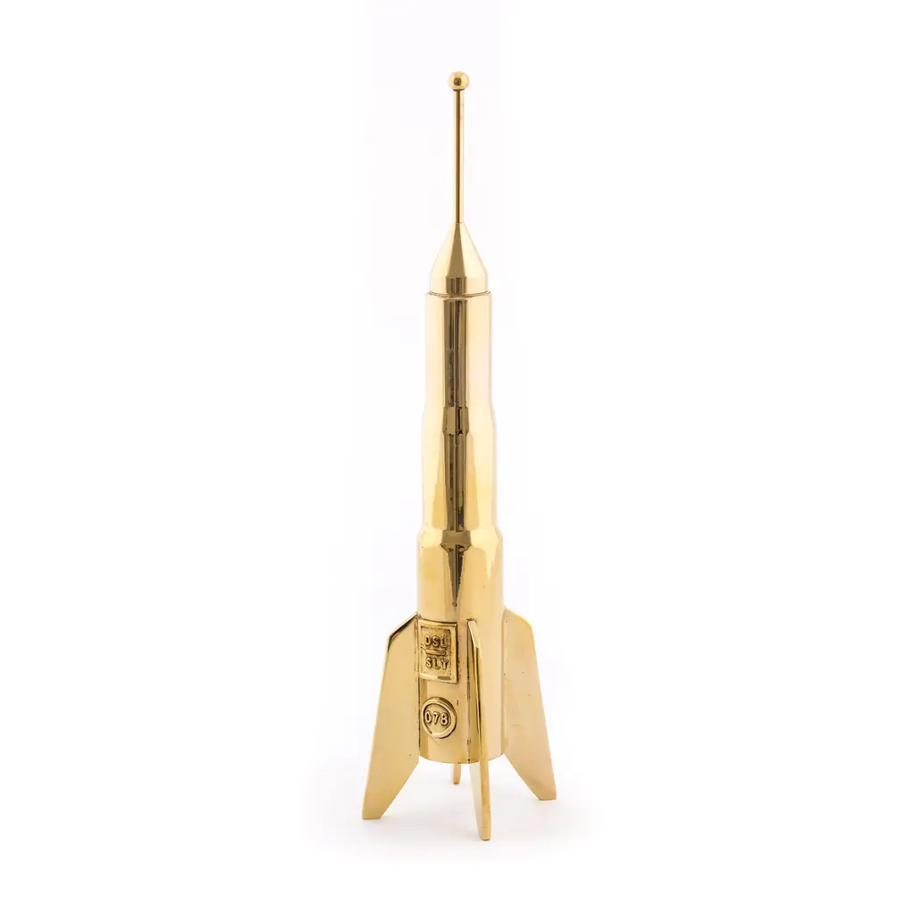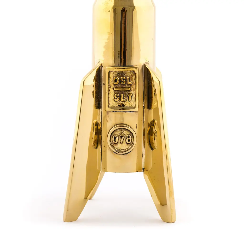 Take your dinnerware to another level of creativity and elegance with the Cosmic Diner collection designed by Seletti and Diesel Living. This Lunar Hard Rocket Candle Holder illustrates the range’s distinctive style perfectly. Shaped like a rocket, the brass candle holder adds a touch of artistry and ingenuity to your tableware collection. Gorgeous even when not in use, this item truly comes to life when a lit candle is placed inside the holder. Use it on its own or in a set of three for a larger table. This Lunar Hard Rocket candle holder measures 35.5 cm in height with the top section or 24 cm without it, and has a diameter of 10 cm.
