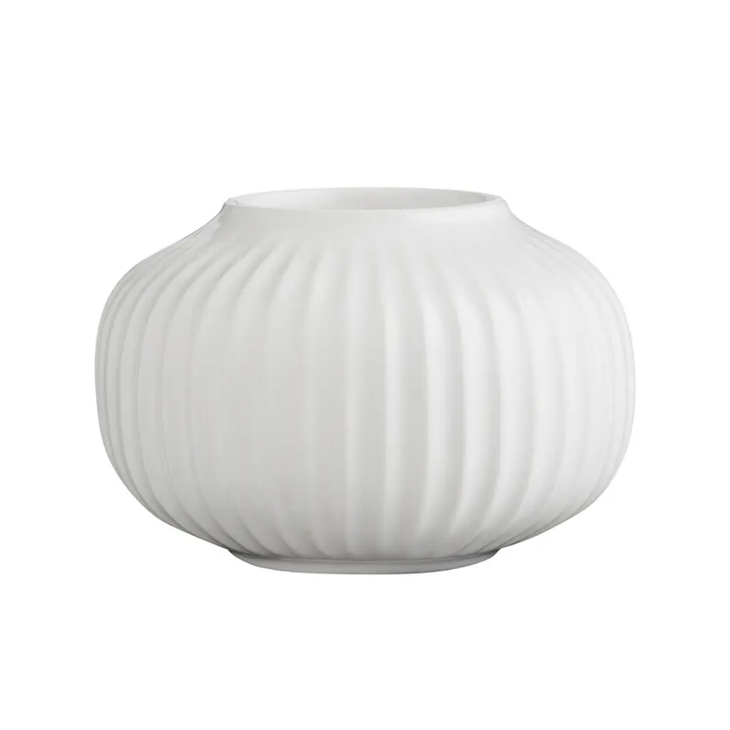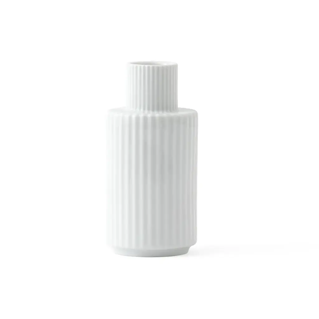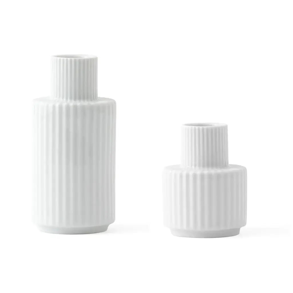 The small taper candle holder by Lyngby Porcelaen stands 2.8". The simple, stylish design of the taper candle holder matches the design of the original Lyngby vase, first produced by Lyngby Porcelæn back in the 1930s. The taper candle holder is designed by Cecilie Toklum, who has created the candle holder with the broad grooves towards the bottom and the narrower grooves at the top. The two taper candle holders complement each other beautifully when used together. Features