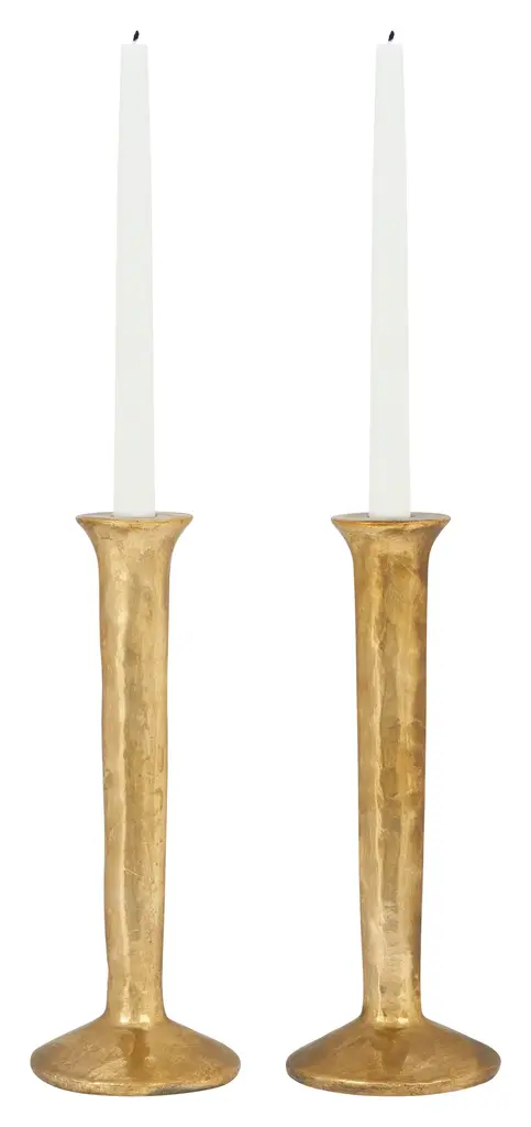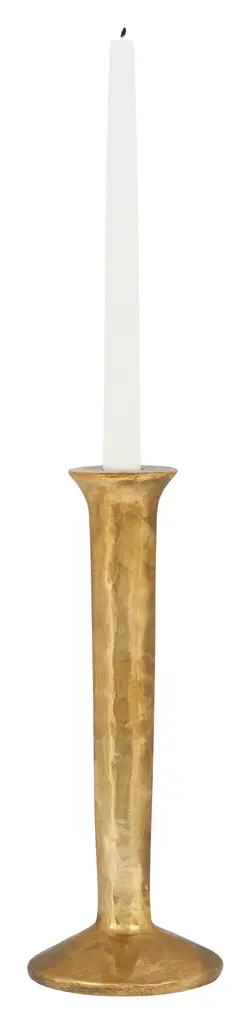 Add a touch of antiquity to your tablescape with our Magna Candlestick. Crafted from polyresin into a simple, spool-shaped silhouette, this taper holder takes on a well-aged feel thanks to its mottled gold finish and varied texture, which evokes the look of hammered metal. Perfectly sized to hold your standard taper candle, we love Magna adding a bit of height and shine to a vignette or as a pair flanking a floral centerpiece on the dining table. •polyresin•mottled gold finish Dimensions •4.75" diameter x 12.5"H