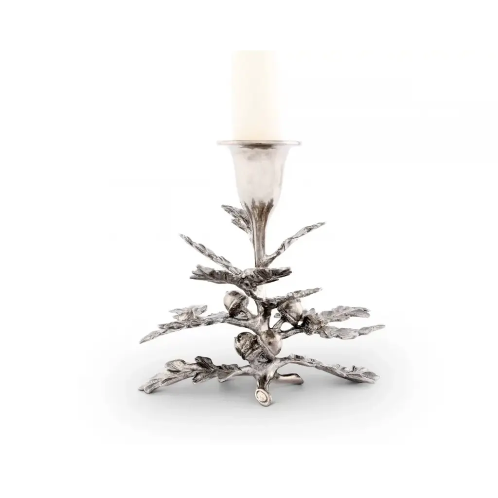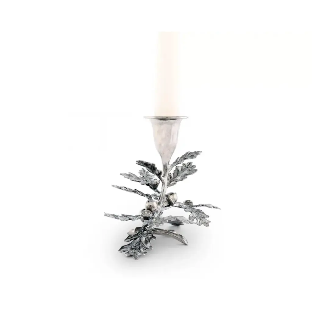 Elegant natural décor and soft romantic candlelight are on hand when you decorate with Vagabond House's Acorn and Oak Leaf Single Taper Candlestick. Crafted from our pure pewter, the single, highly polished classic socket is supported by an intricately detailed pewter rendition of an oak twig studded with leaves and tiny acorns. Vagabond House is a family-owned American company specializing in fine pewter tableware, servingware and giftware. Largely inspired by nature, their exclusive products are designed to be unique, functional heirlooms for those who seek to express tradition and style in both family and formal entertaining.