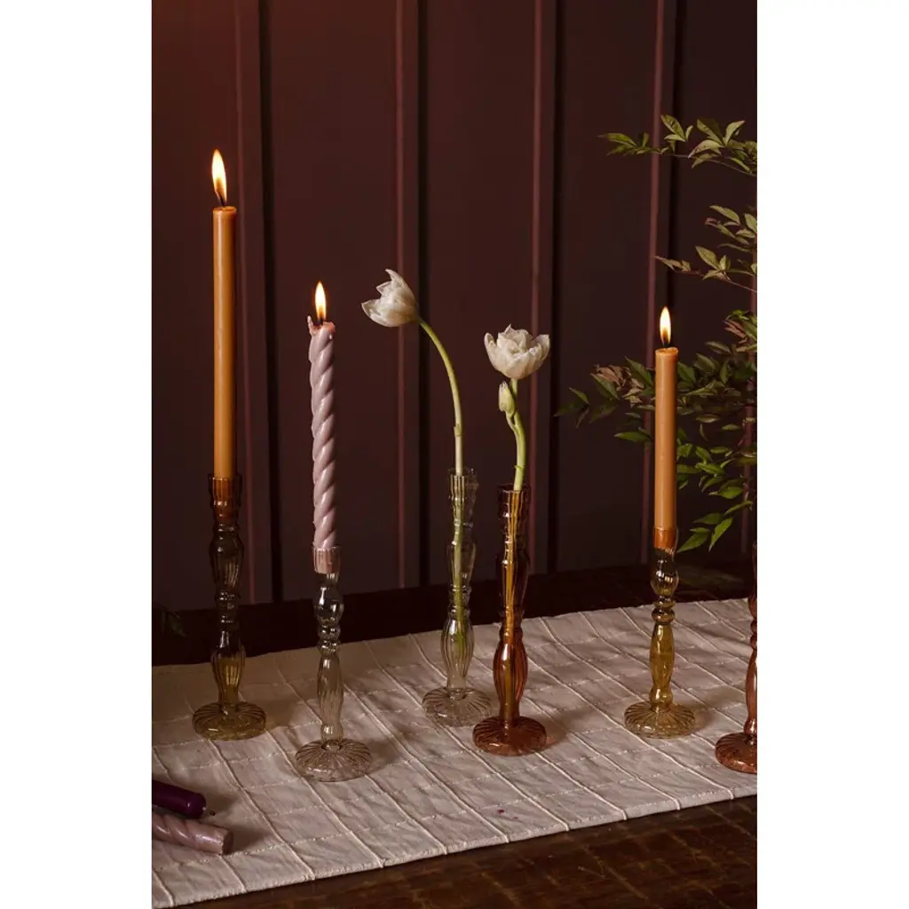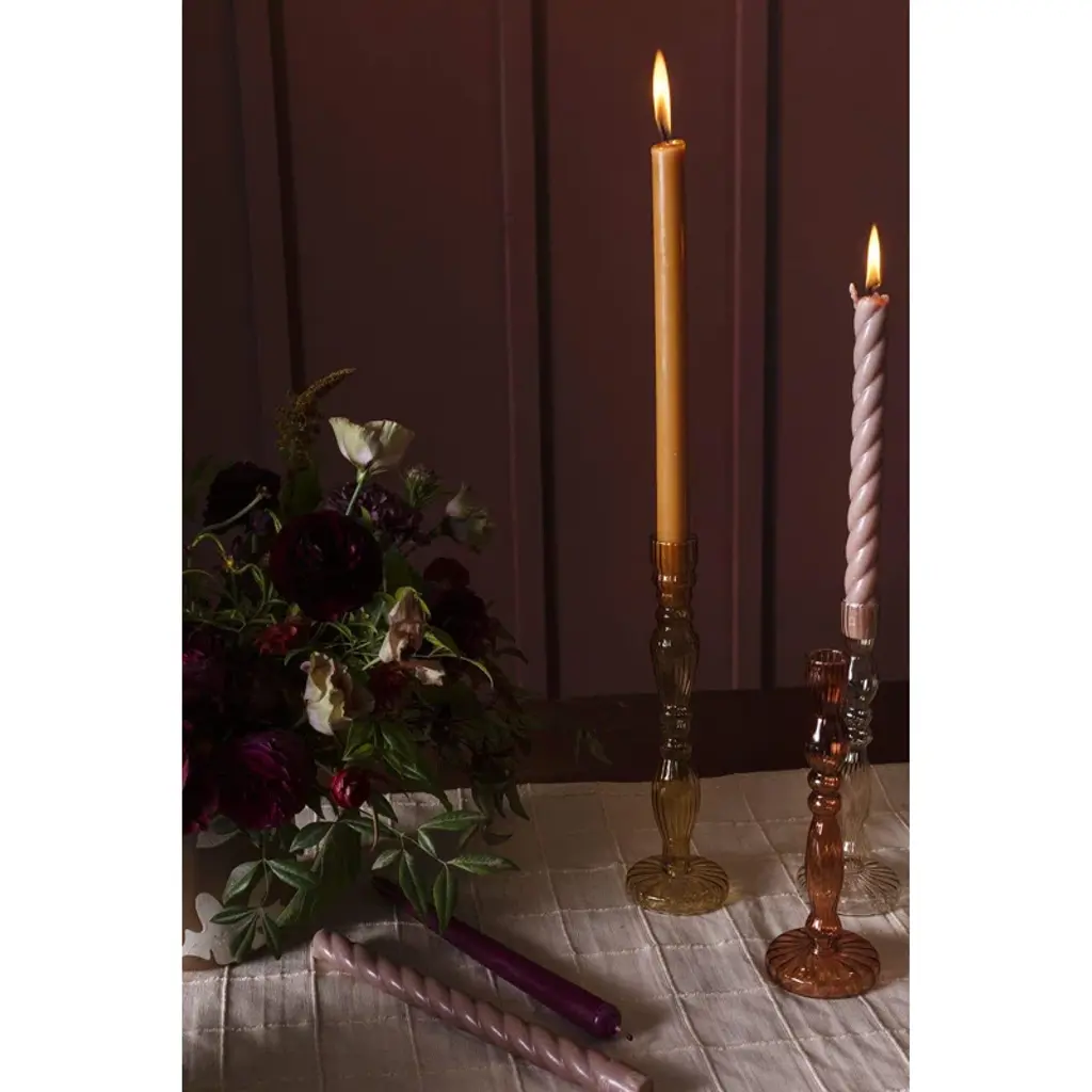 This candlestick is a delicately ribbed glass Diontre in beautiful colors, perfect for a holiday table. Each footed Diontre can also be used to hold a taper candle.