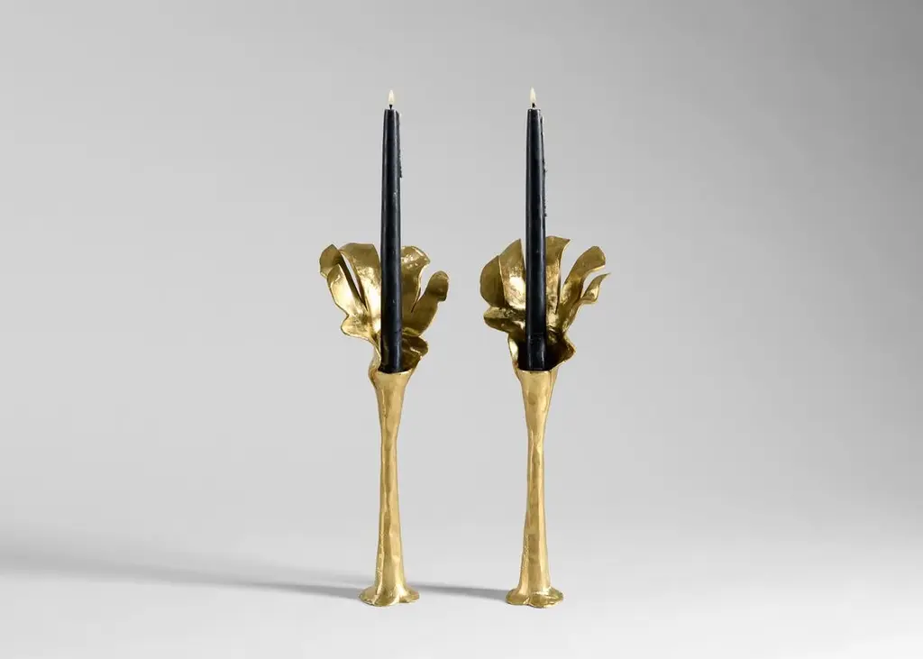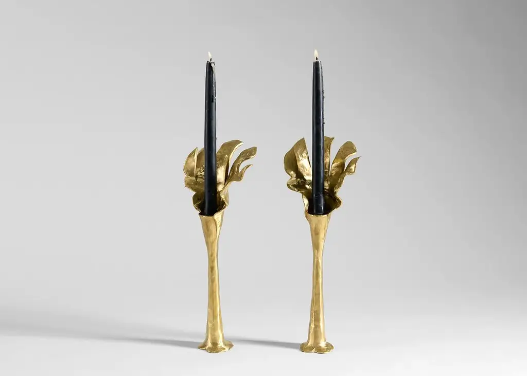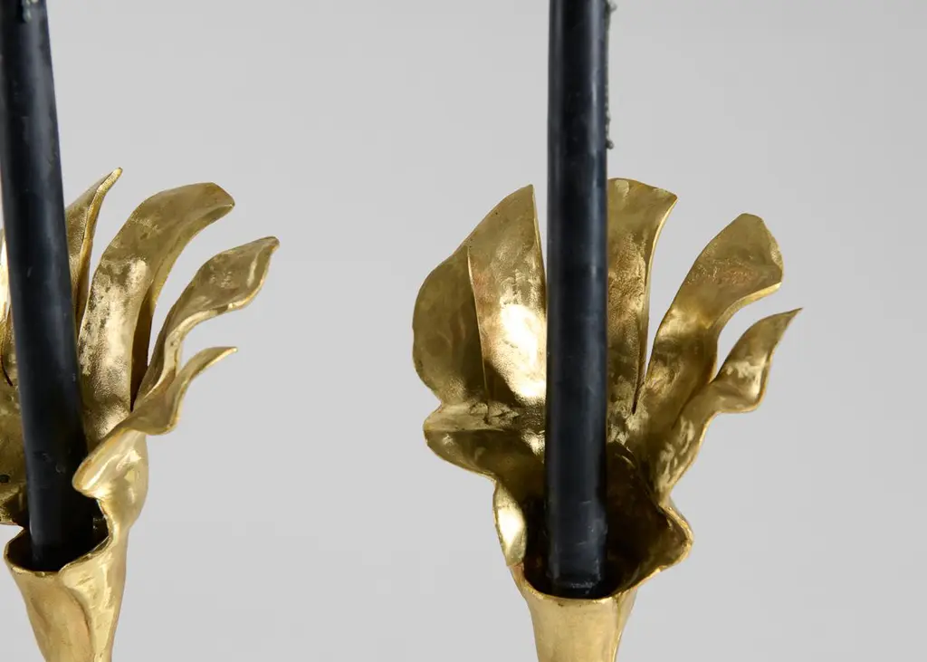 A pair of bronze candlesticks with the playful intimation of flames where the candles are placed.Stamped: MBInscribed: M BankowskyA designer and decorator for over 20 years, Marc Bankowsky creates uniquely beautiful furniture and accessories. In addition to a custom suite of furniture and accessories for the Haute Couture Christian Dior Boutique (designed by Peter Marino) on Avenue Montaigne in Paris, he has also designed accessories such as the Ginkgo leaf candlesticks for renowned restaurateur Pierre Gagnaire, and received a commission from Baccarat for a collection of limited edition objects.Marc studied at L’école Nationale Supérieure des Arts Décoratifs (ENSAD) and at The Ecole Nationale Supérieure des Beaux-Art and currently resides in Burgundy, France.