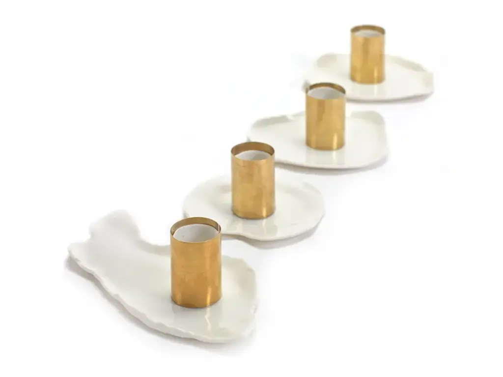 Marie ass/4 is a set of 4 candle holders made of porcelain.Eclectic, a world full of wonderful extremes based on a well-thought-out structure. That is the first thing that comes to mind for the accessories collection of Marie Michielssen. Serax ’s resident designer likes variety, both in style and in her use of materials and colours.Eclectic, a world full of wonderful extremes based on a well-thought-out structure. That is the first thing that comes to mind for the accessories collection of Marie Michielssen. Serax ’s resident designer likes variety, both in style and in her use of materials and colours. From papier-mâché through concrete to porcelain, cheerfully coloured or in muted natural colours, inspired by constructivism or by the earth in its most rudimentary form, each collection is completely different.