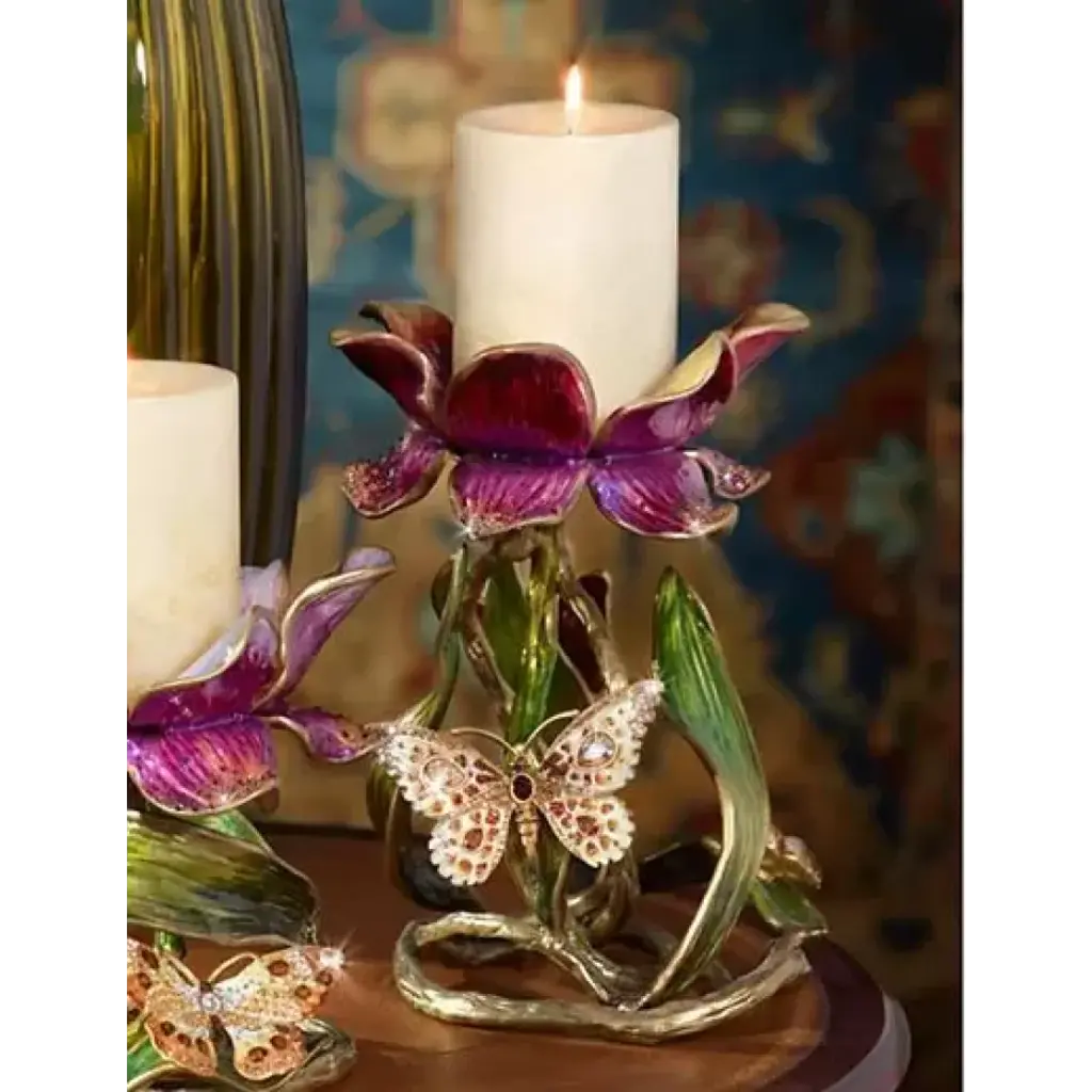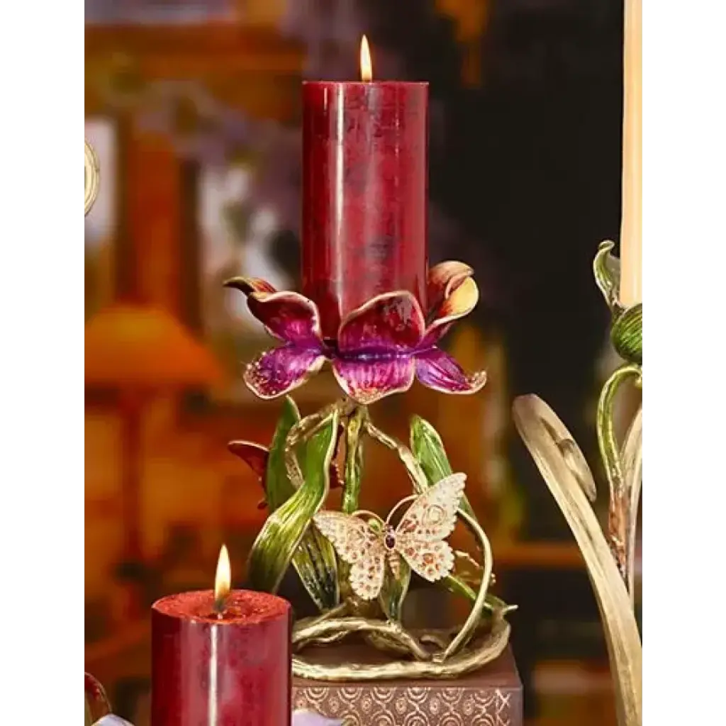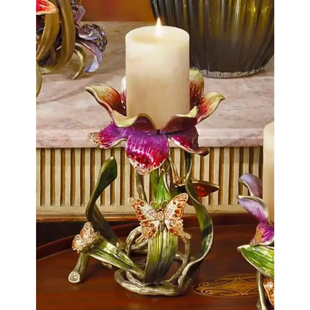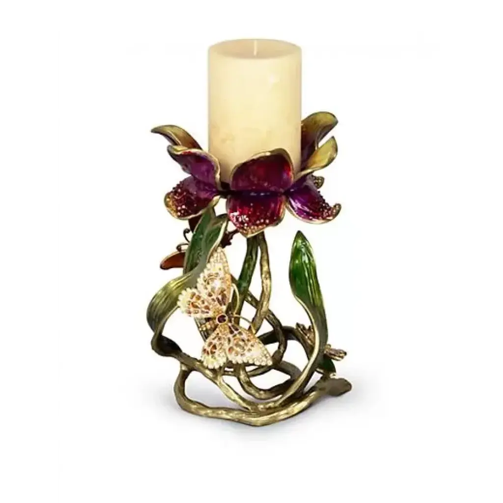 The patina of the polished brass Meredith Floral 9" Pillar Candle Holder is illuminated by the glow of candlelight. Each one is first crafted in India, and then embellished with jeweled butterflies, flowers, and enamel in our New York workshop.