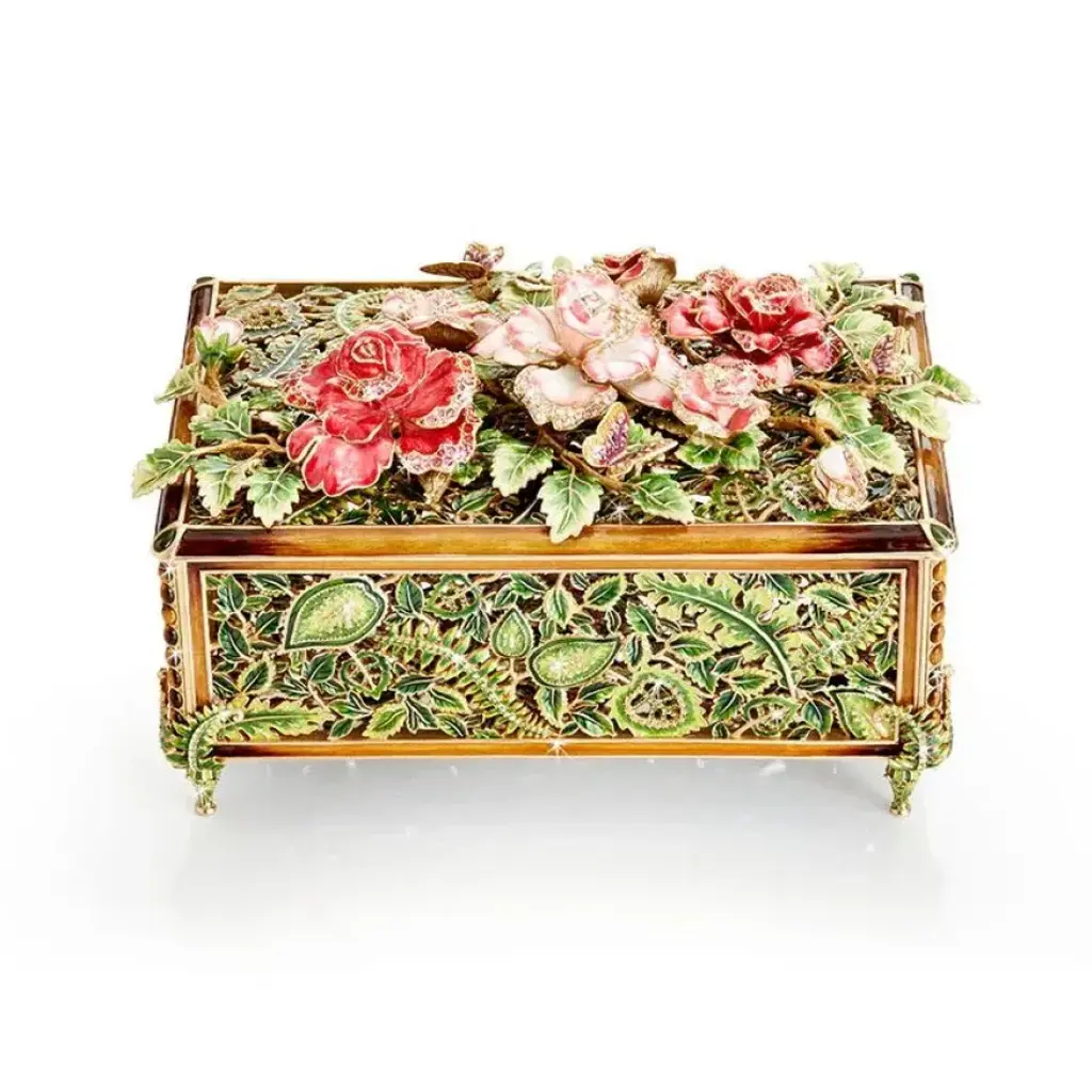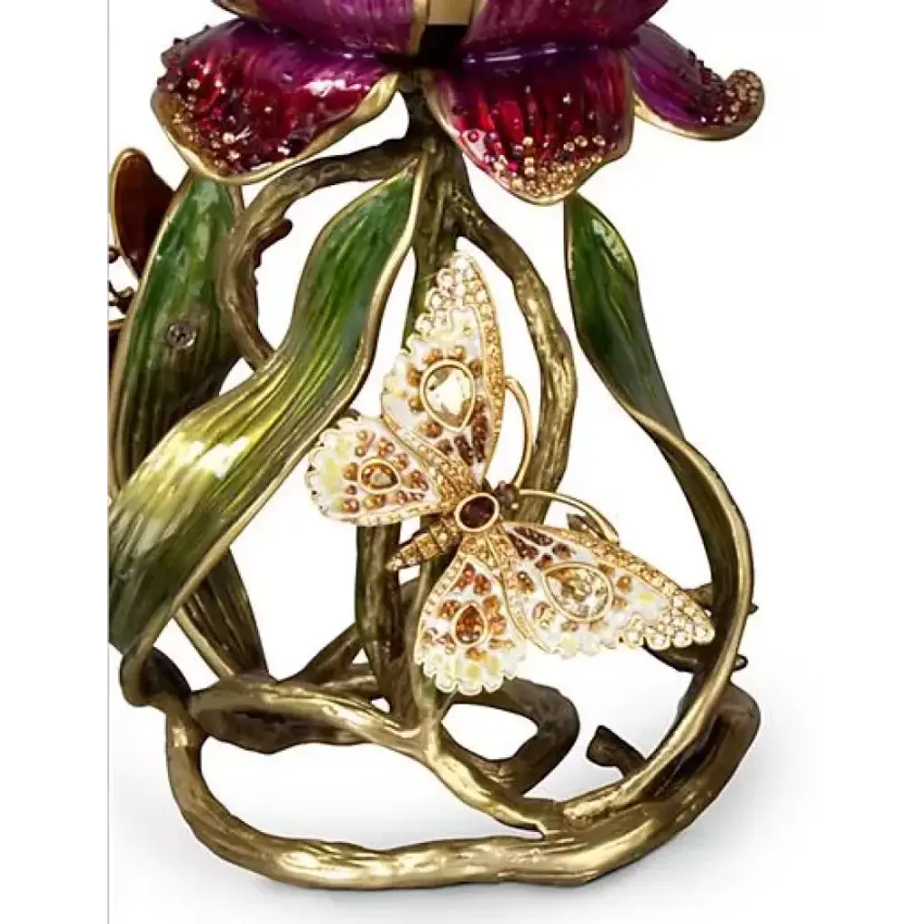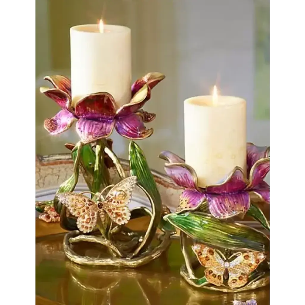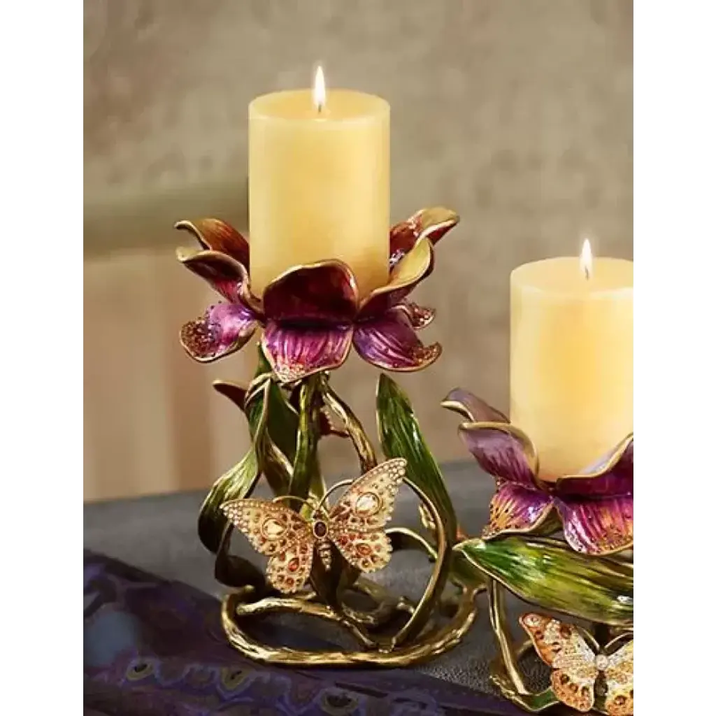 The patina of the polished brass Meredith Floral 9" Pillar Candle Holder is illuminated by the glow of candlelight. Each one is first crafted in India, and then embellished with jeweled butterflies, flowers, and enamel in our New York workshop.